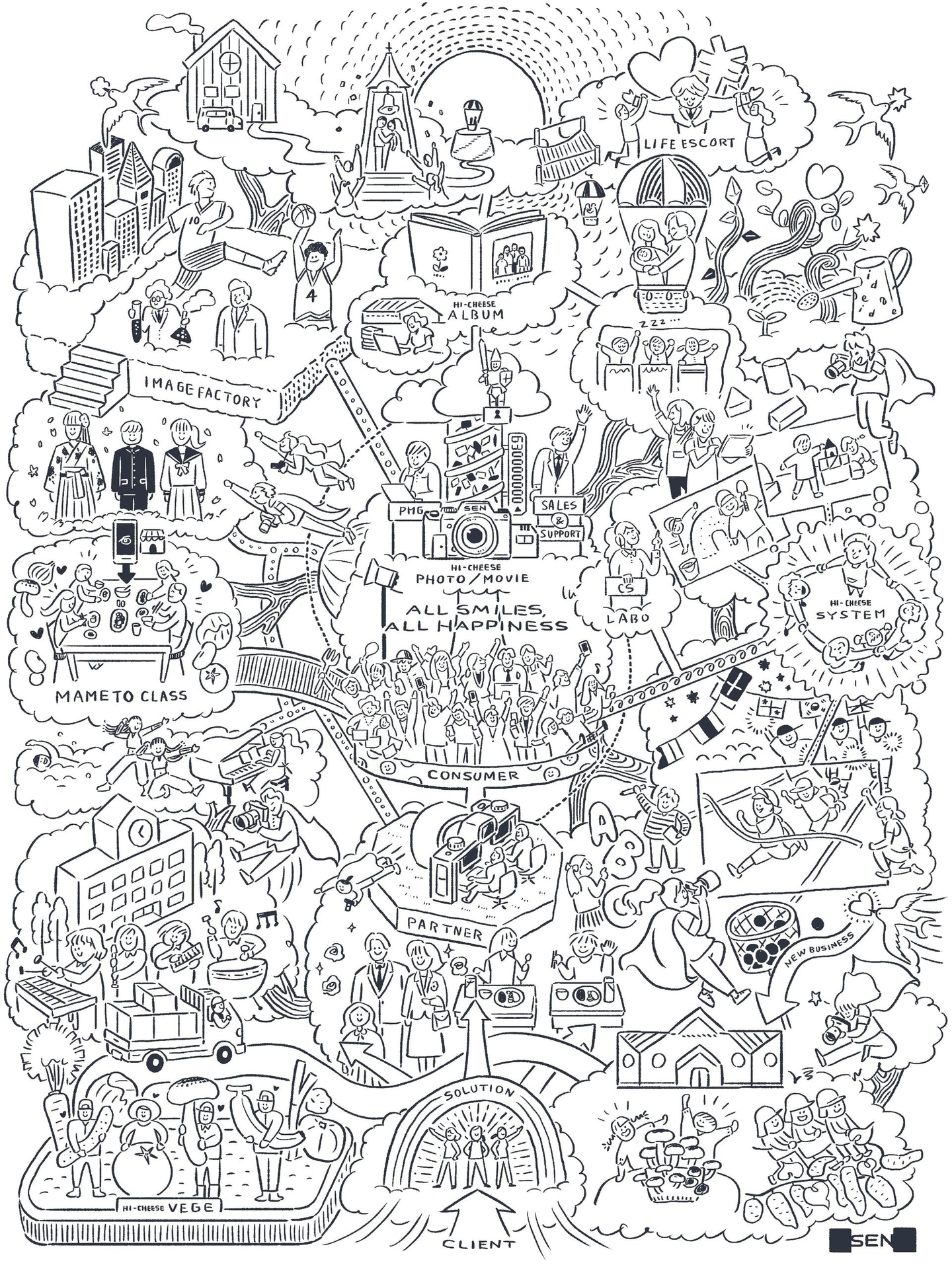 子どもが生まれて成長し大人になり、結婚して子どもが生まれてその子供がまた成長し...と写真を中心として我々のサービスが誰の笑顔を作って行くのか、そしてどんな未来を創っていきたいのか?を表現しております。