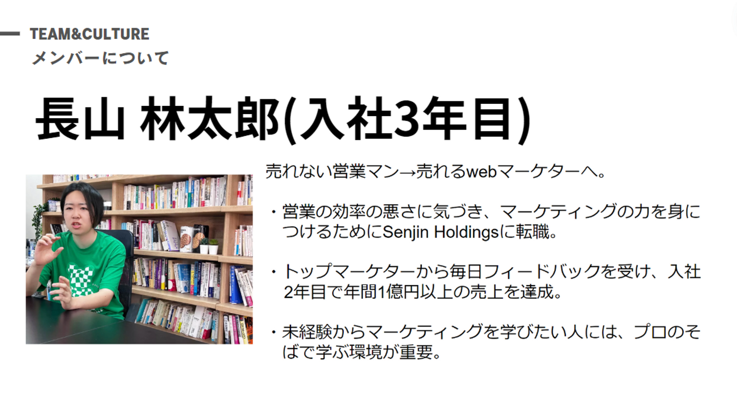 元々、営業マンをだった彼ですが、より大きな数字のインパクトを出したいという想いからSenjinに転職。