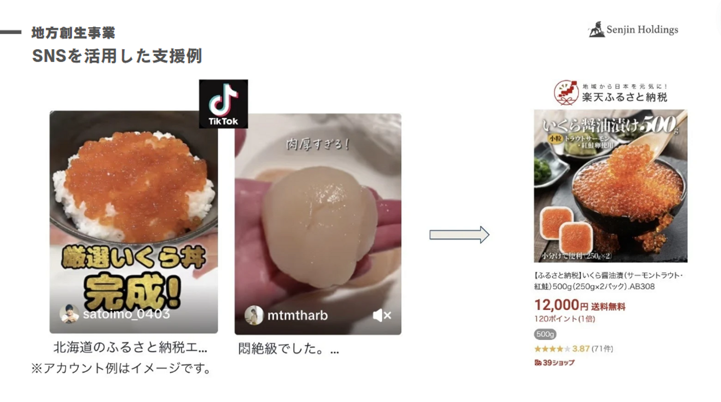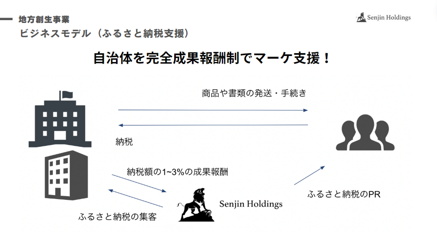 自治体の商品をSNS・ECサイトを通じてPRを行い、消費者の納税額の1~3%を成果報酬としていただくというものがビジネスモデルになります。