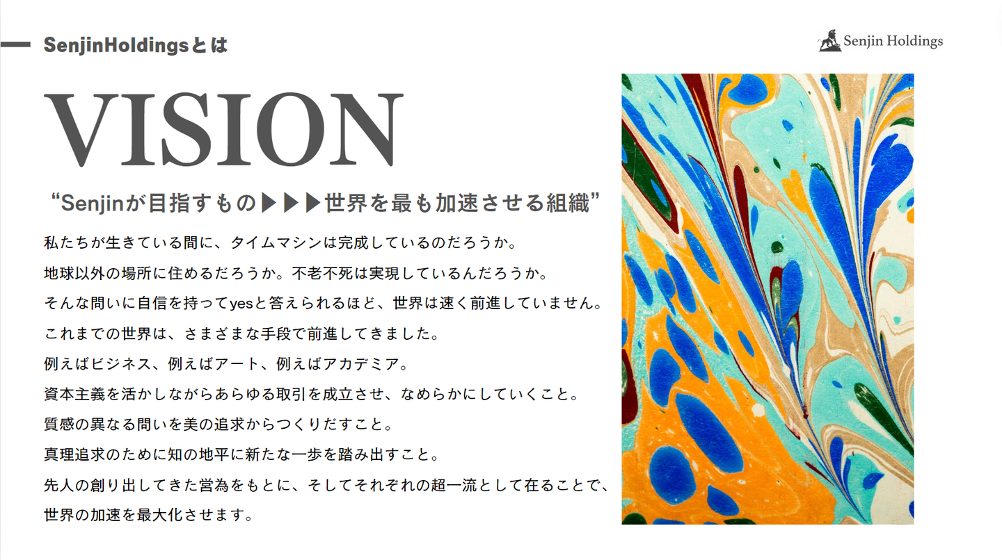 Senjin Holdingsでは、「世界を最も加速させる組織」というビジョンを掲げています。