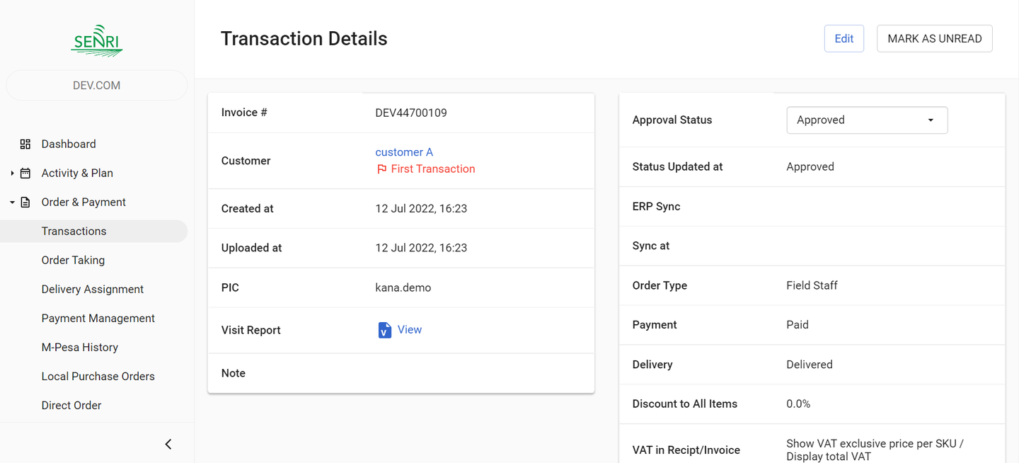 Transaction listとTransaction detailsでオーダーの詳細の確認、編集、承認ができます。