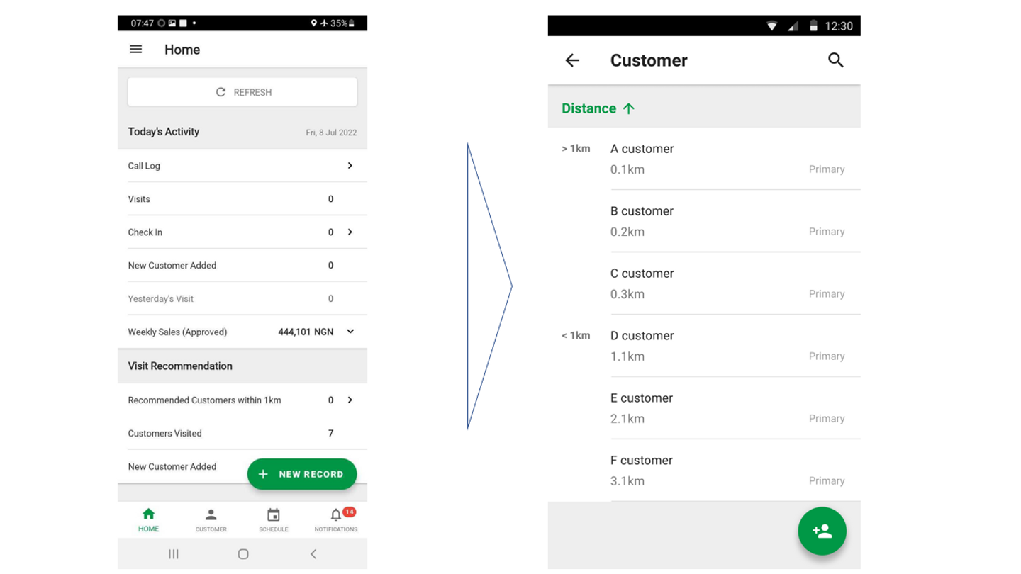 Homeから、カスタマー一覧に移動します。カスタマーは現在地から近い順に並んでいるので、リストの中から該当のカスタマーを選択します。