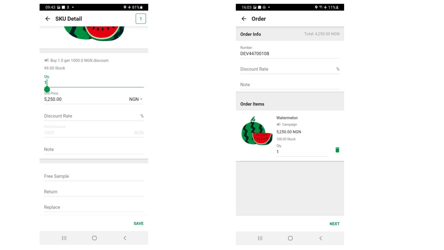商品を選んで、数量を入れます。各社結構細かく顧客ごとの価格や割引を設定していますが、事前にManagerが設定しておくことで、営業スタッフは特に迷うことなく価格や割引を適用できます。