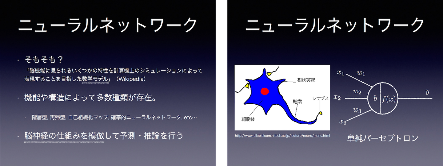 <ニューラルネットワークの概要と人の脳のニューラルネットワークのイメージと、ニューラルネットの単純パーセプトロンの模式図>