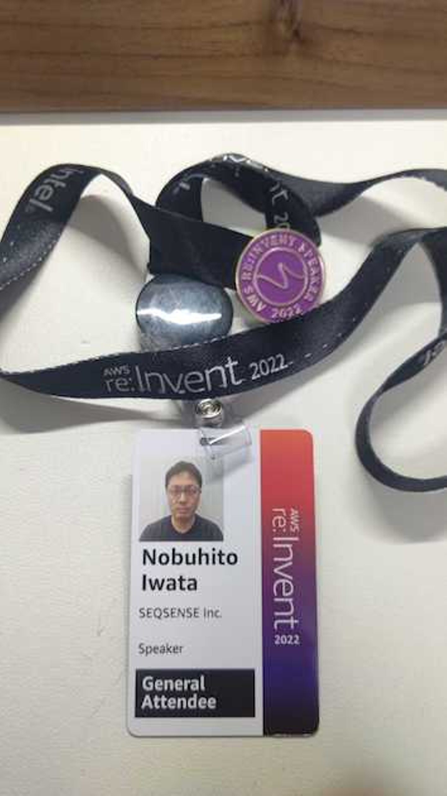 午前中から準備するのでBadge Pickupを空港で行う必要があったため、空港まで受け取りに行きました。そこで現地でサポートしていただいたAWSの方と記念撮影しました。(左からAWS・三平さん、SEQSENSE・渡辺さん、SEQSENSE・岩田、AWS・Lindonさん)