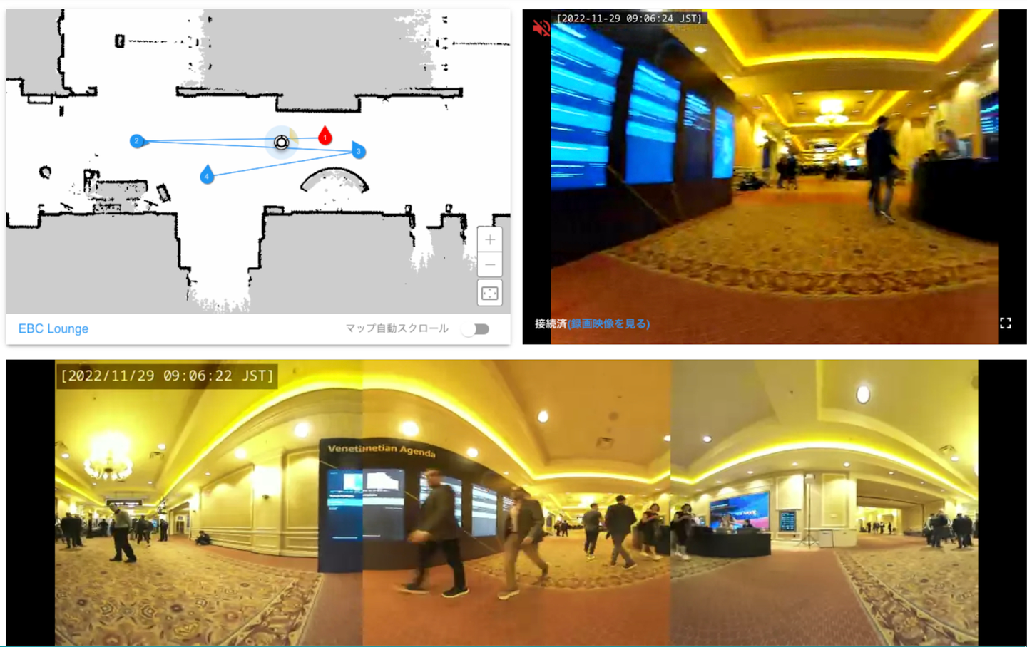基本的には2台のロボットをEBCラウンジ内で巡回させておいて、用意していただいたモニターにコンソールの画面を表示しておき説明を行いました。(私は英語ができないのでほぼコンソール画面の操作だけでしたが、、、)