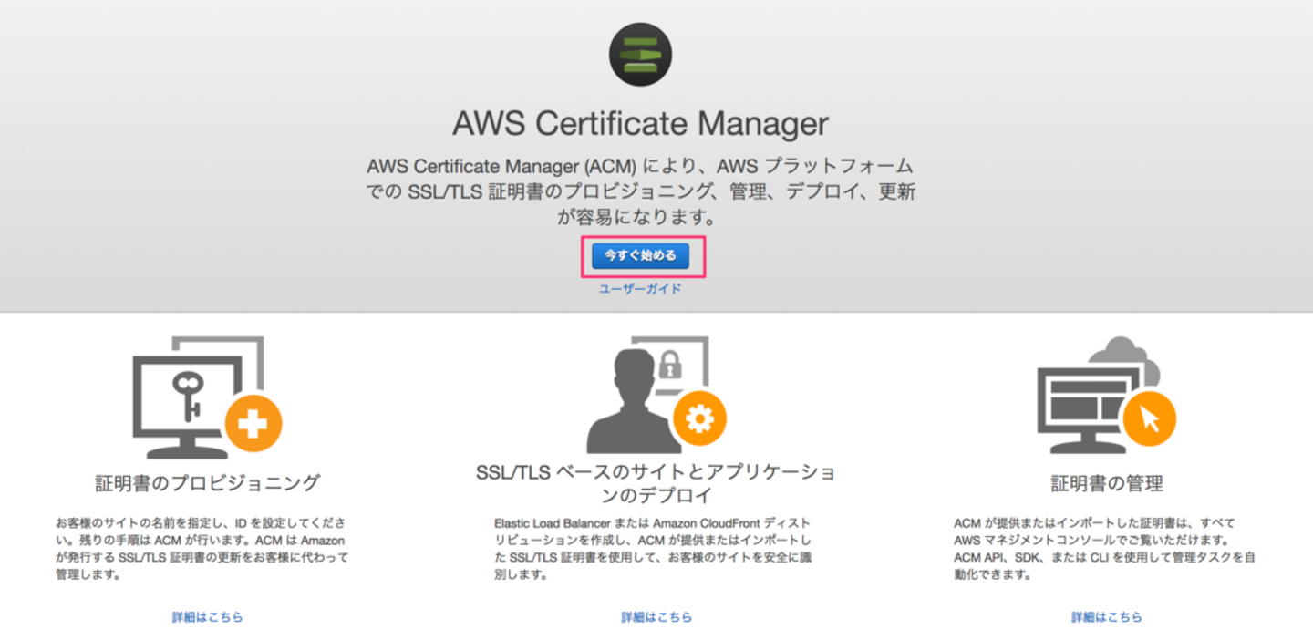 なお、今回はDNSサーバはムームードメインを使いましたが、設定方法などは他のDNSサービスでもほぼ同じだと思います。 ACMの画面に行き、「今すぐ始める」をクリックします。