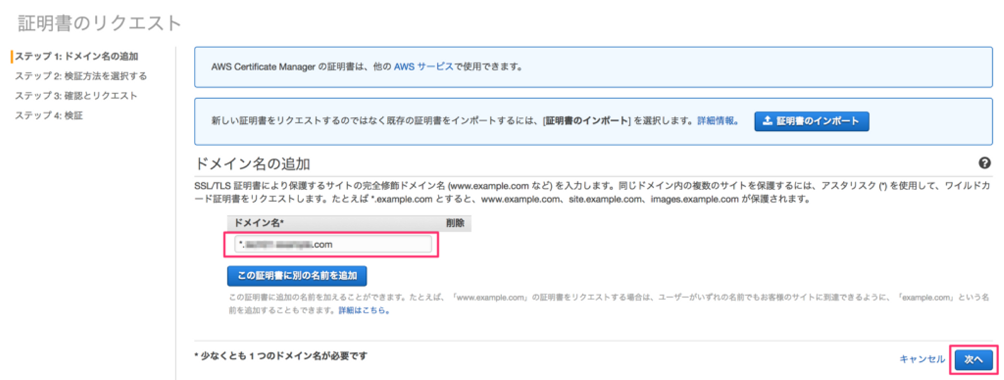 ドメインを入力し、「次へ」をクリックします。