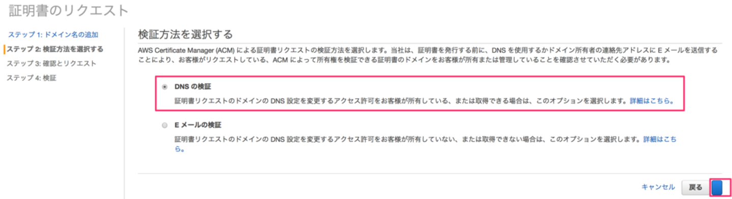 「証明書リクエストのドメインのDNS設定を変更するアクセス許可をお客様が所有している、または取得できる場合は、このオプションを選択します。」と書いてあるのを見ると、おそらくメールよりもDNSの検証を推奨しているように見えます。
