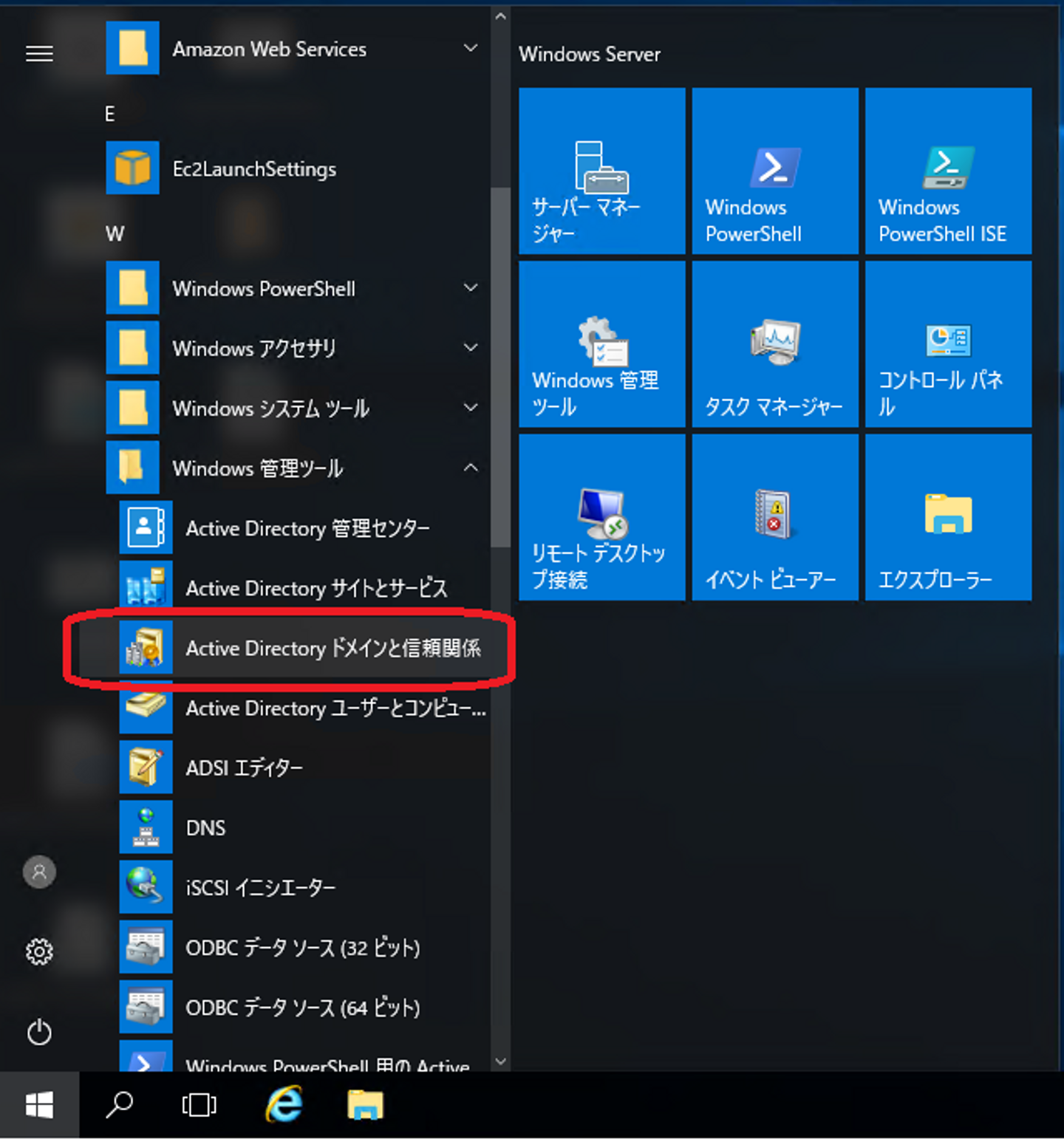スタートメニューのWindows管理ツールから、「Active Directoryドメインと信頼関係」をクリックします。