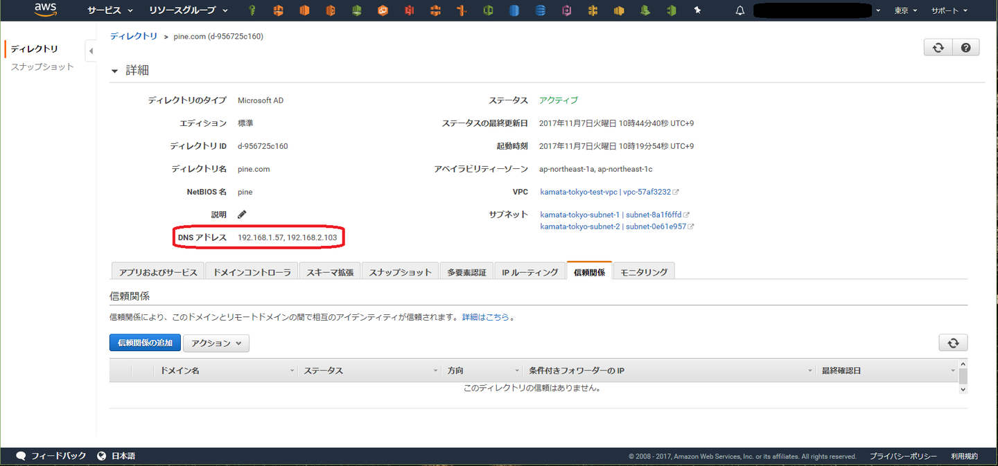 MSADのドメインコントローラーのIPは、マネジメントコンソールから確認できます。