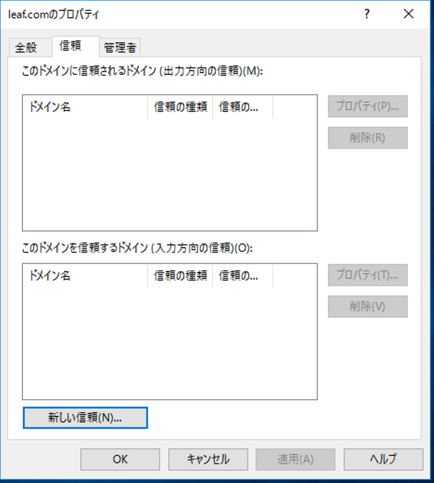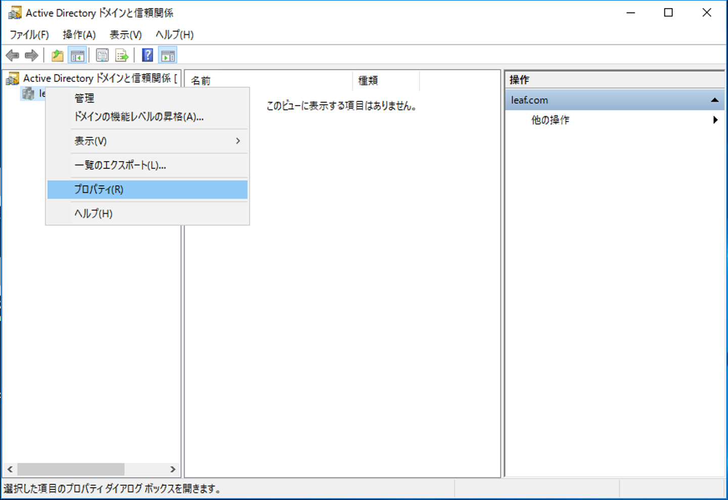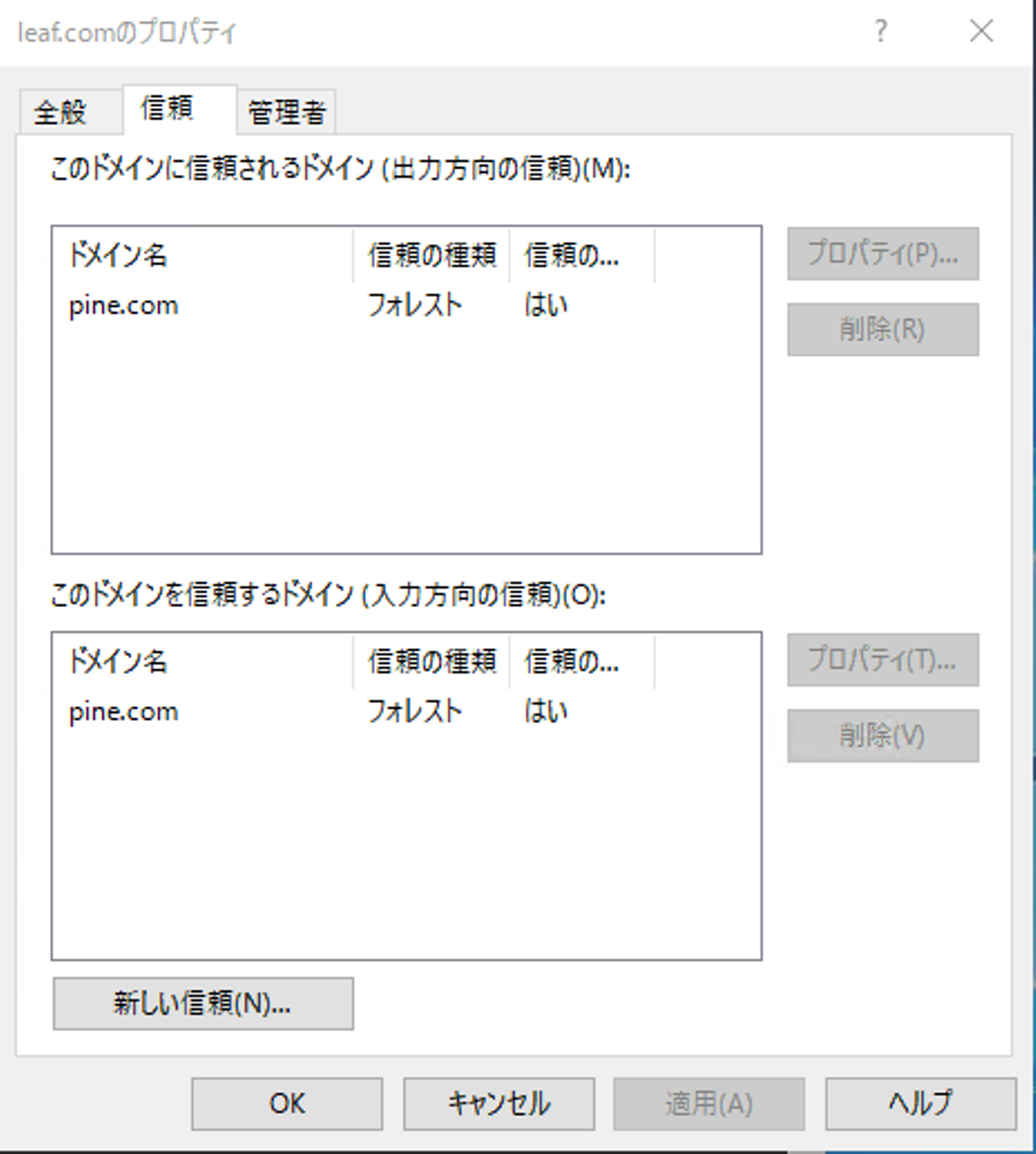 まずは、leaf.comのドメインコントローラー側から、pine.comのドメインの信頼関係を設定します。