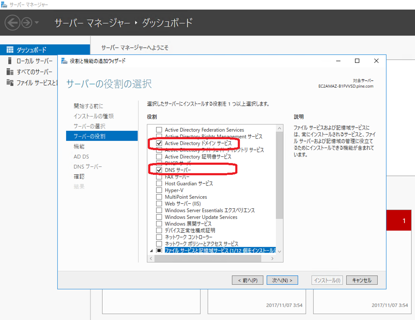 ドメインコントローラーの設定とDNSの設定を行えるように、サーバーマネージャーを起動して、役割を追加しておきます。