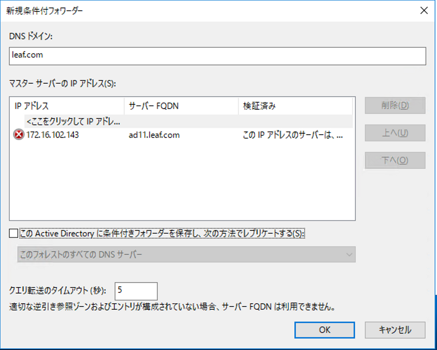 役割を追加したら、先程と同じ手順で、今度はpine.comのDNSにleaf.comの条件付きフォワーダーの設定をします。
