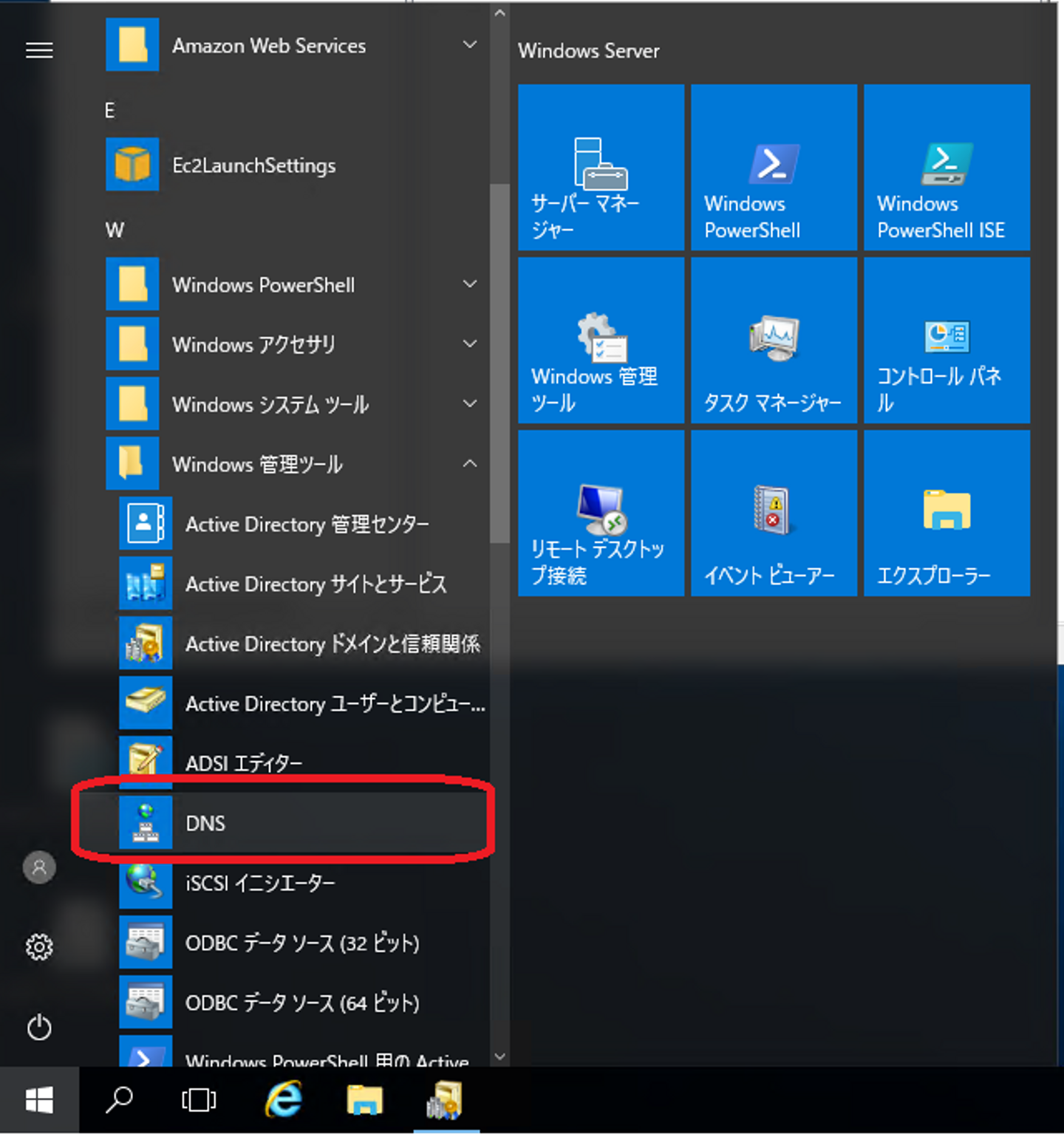 ログインしたら、スタートメニューのWindows管理ツールから、「DNS」をクリックします。