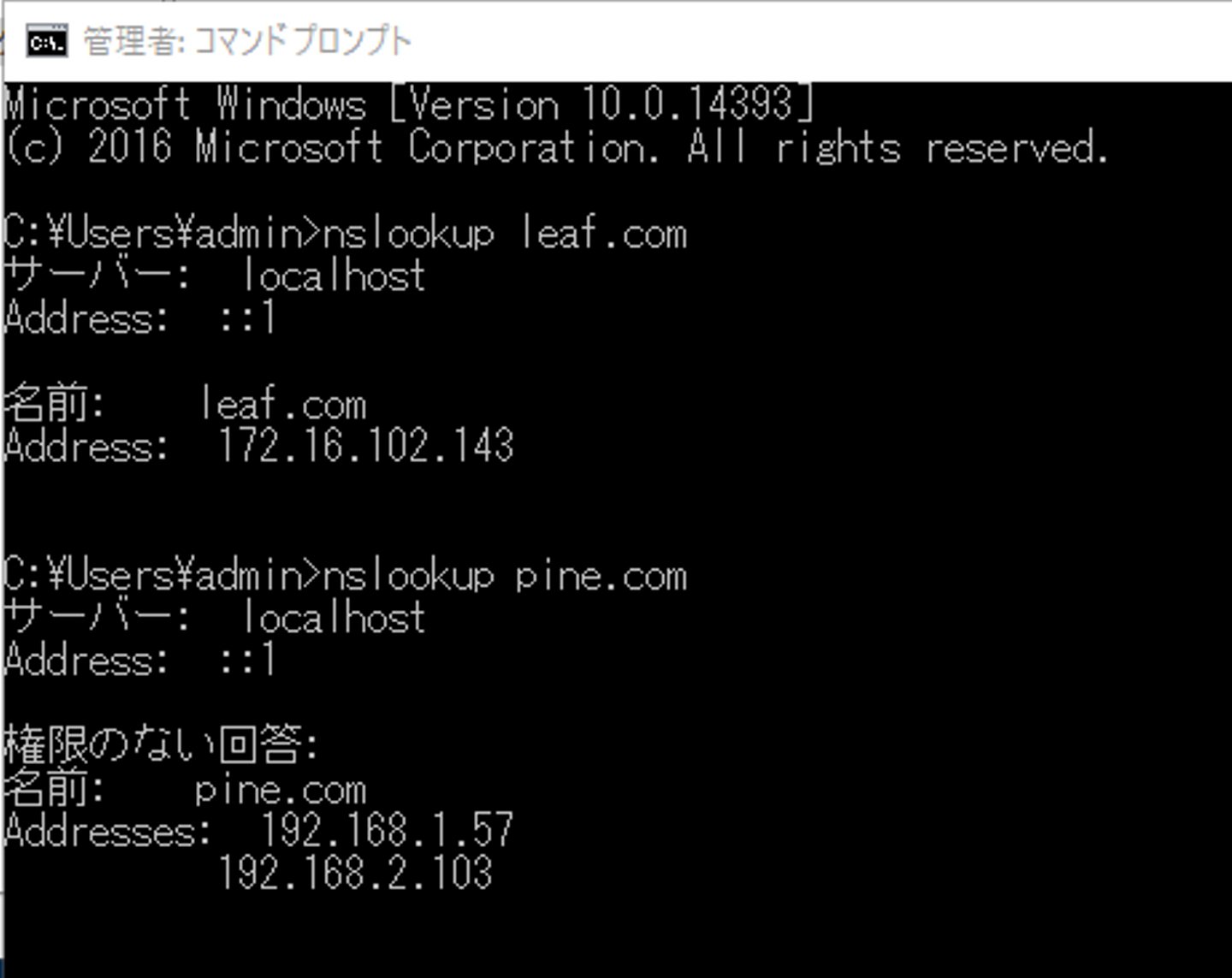 設定ができたら、leaf.comドメインの情報を、pine.comのDNSサーバーに確認して、エラーにならないか見てみましょう。どちらもエラーにならずに終われば、事前準備が整いました。