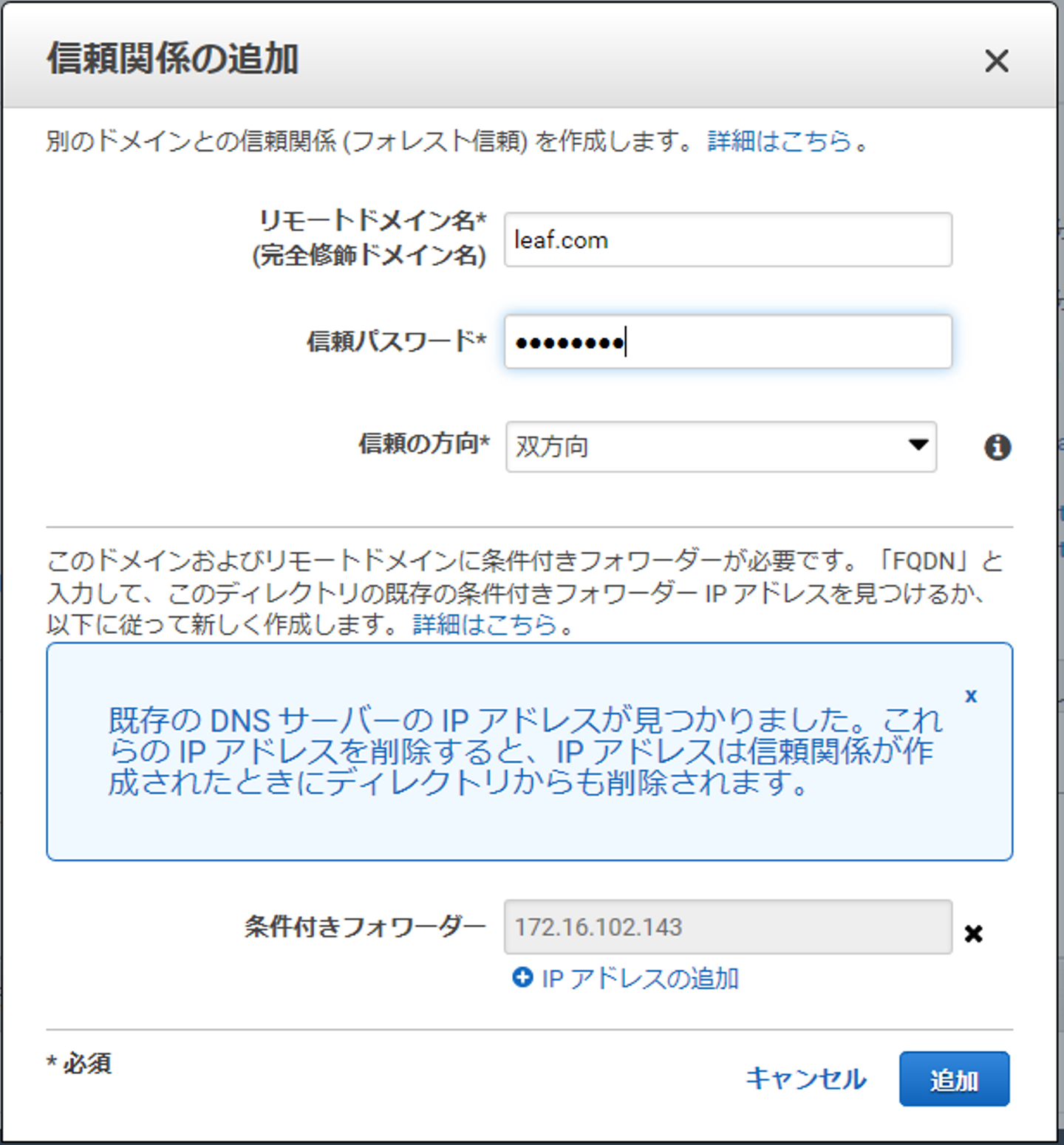DNSドメインには、信頼関係を確立する相手のドメイン名を、IPアドレスは、相手のドメインのDNSサーバーアドレス(通常はドメインコントローラーのIPアドレス)を入力します。