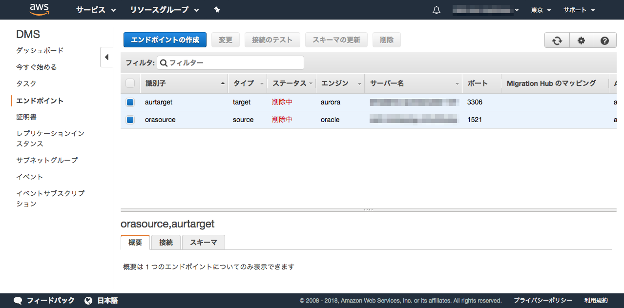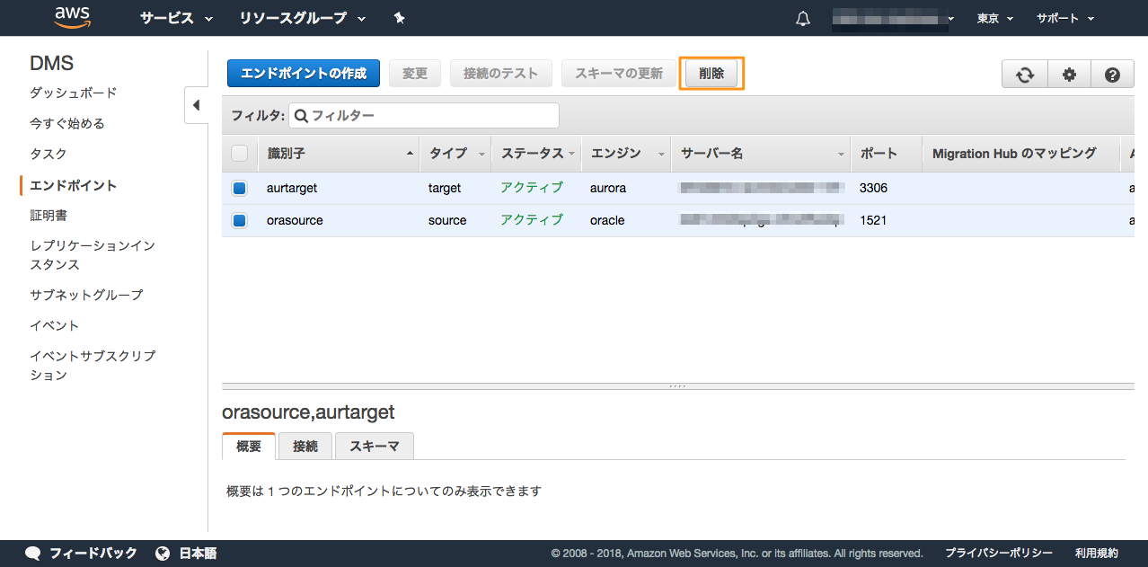 左メニュー → 「エンドポイント」→ Oracle のソースエンドポイント (orasource)を選択→「削除」ボタンを押す。