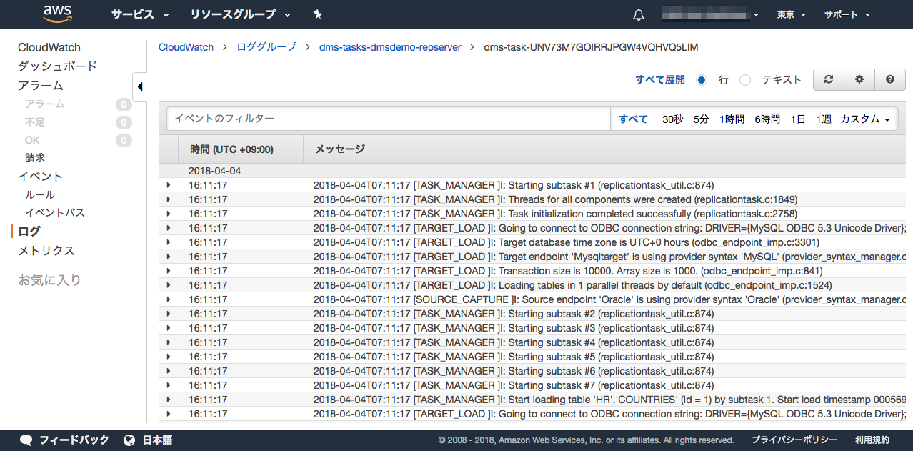 また、ログ出力を有効にしている場合、CloudWatch Logsから移行ログを見ることができます。