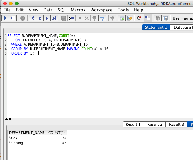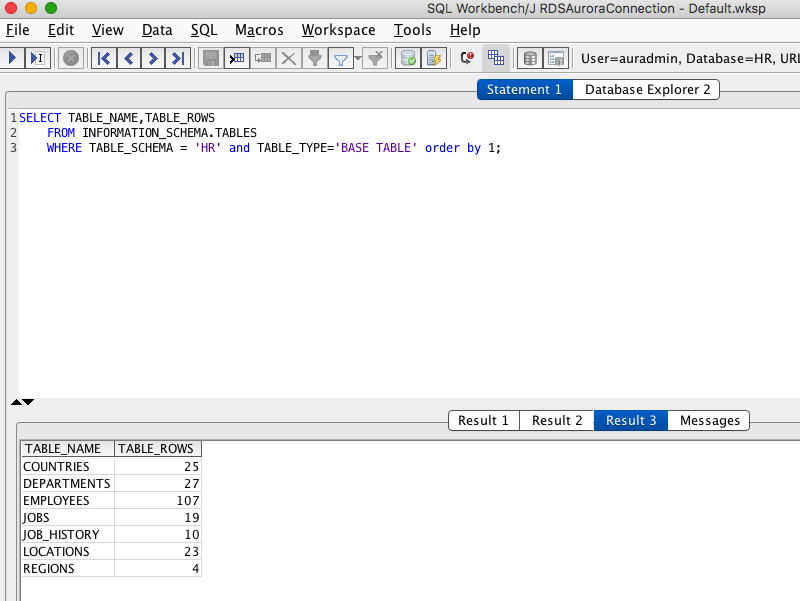 チュートリアルの手順に従って、SQL Workbench/J からAuroraに接続し、確認用のSQLを発行します。