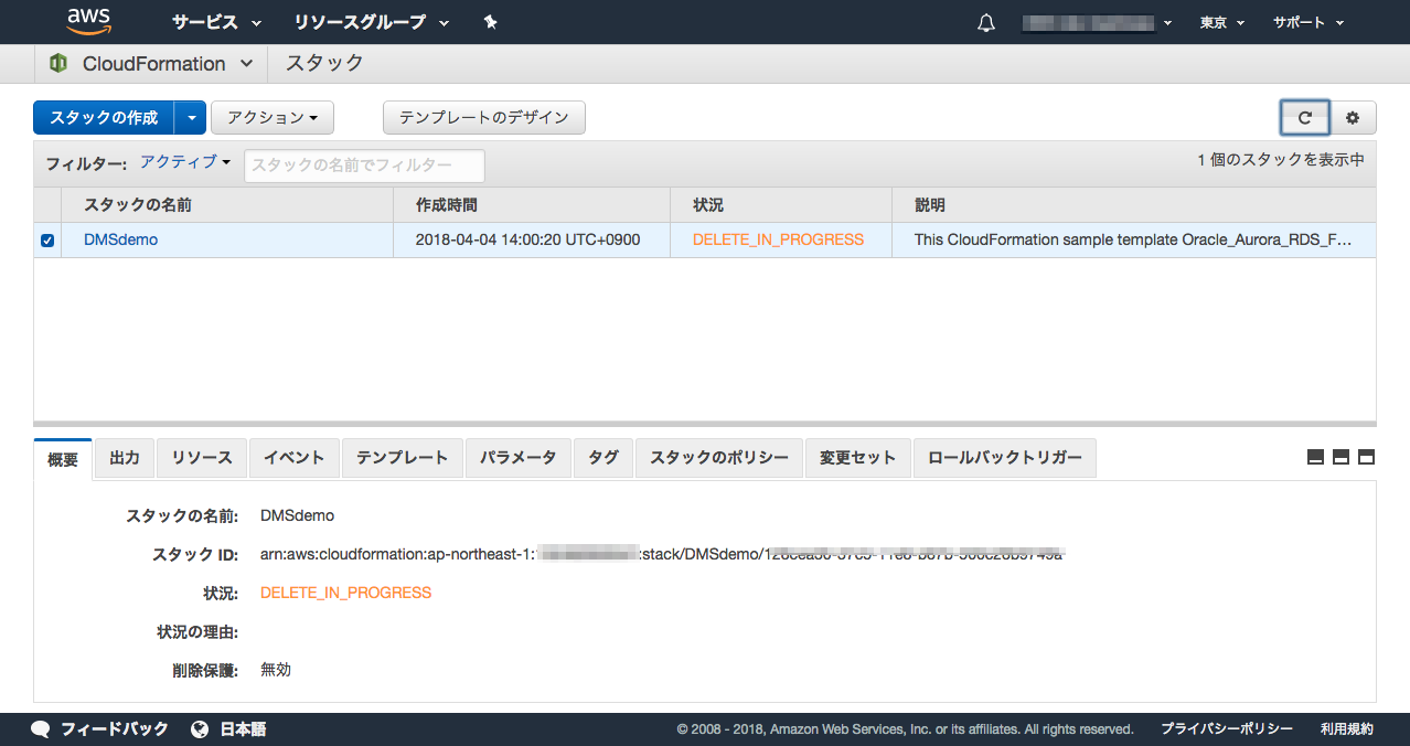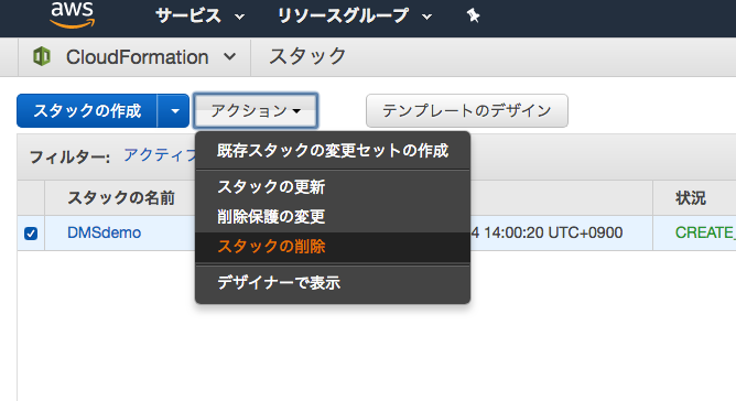 AWS マネジメントコンソールから、CloudFormationに移動し、対象のスタックを選択後、「スタックの削除」を選択します。