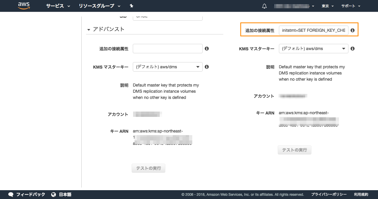 また、ロード時の外部キーチェックの無効化、DMS が実行するトランザクションを自動コミットさせるため、 「アドバンスト」の項目では、「追加の接続属性」 に「initstmt=SET FOREIGN_KEY_CHECKS=0, autocommit=1」を入力しておきます。
