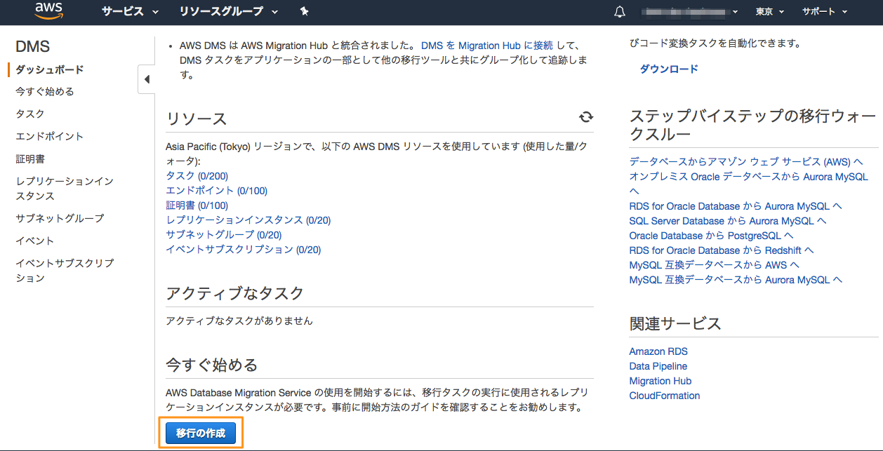 AWS マネジメントコンソールにサインインし、AWS DMS を選択して、「移行の作成」ボタンを押します。
