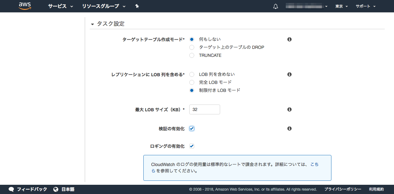 「ロギングの有効化」をチェックした場合、CloudWatch Logsに移行ログが記録されます。(有効にした場合、CloudWatch Logsの料金が発生します)