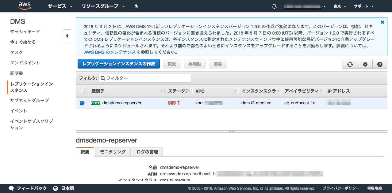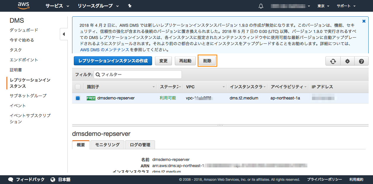 左メニュー → 「レプリケーションインスタンス」→レプリケーションインスタンス (DMSdemo-repserver)を選択→「削除」ボタンを押す。