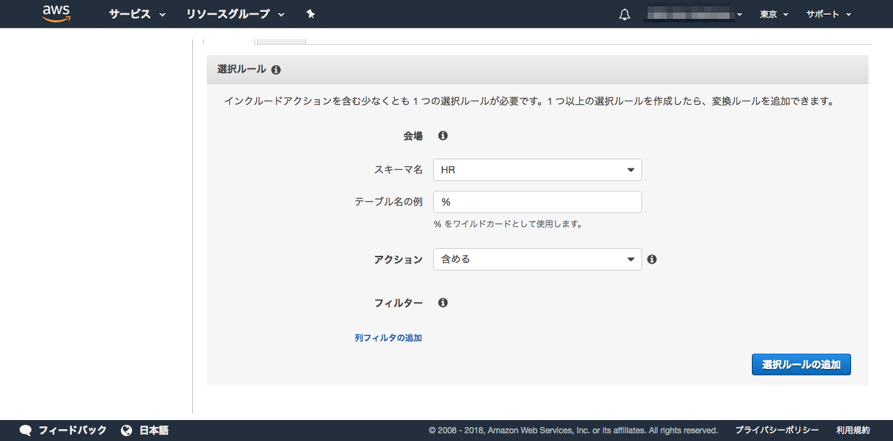 スキーマ名には「HR」を選択し、「選択ルールの追加」ボタンを押します。