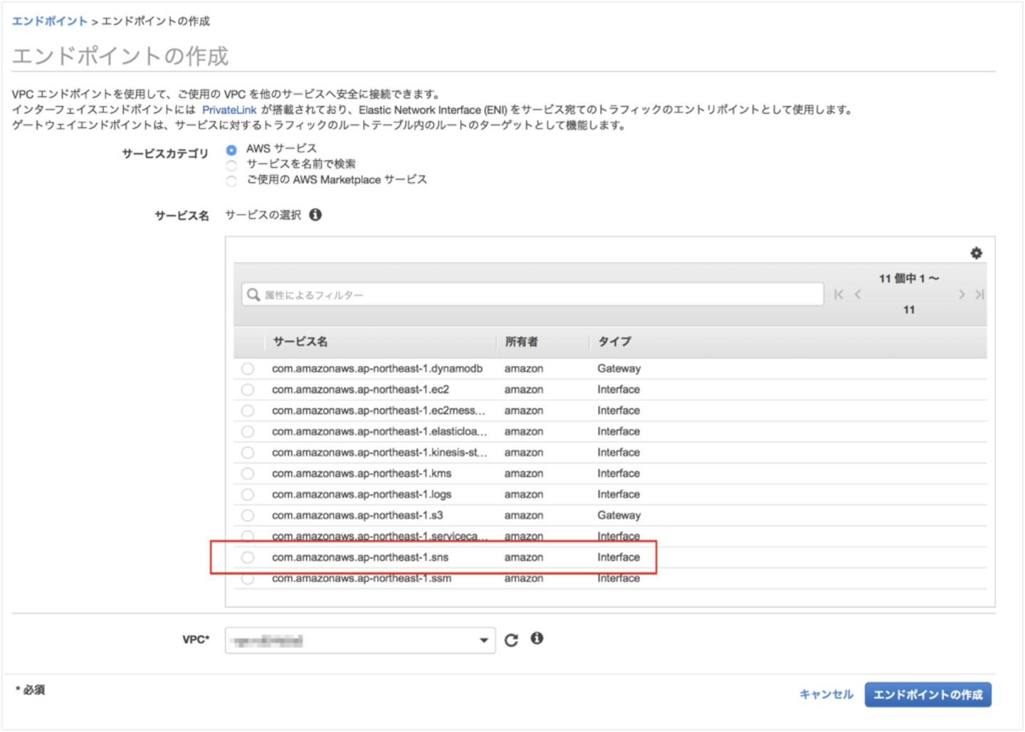 確かに、今までなかった com.amazonaws.ap-northeast-1.sns の文字が!