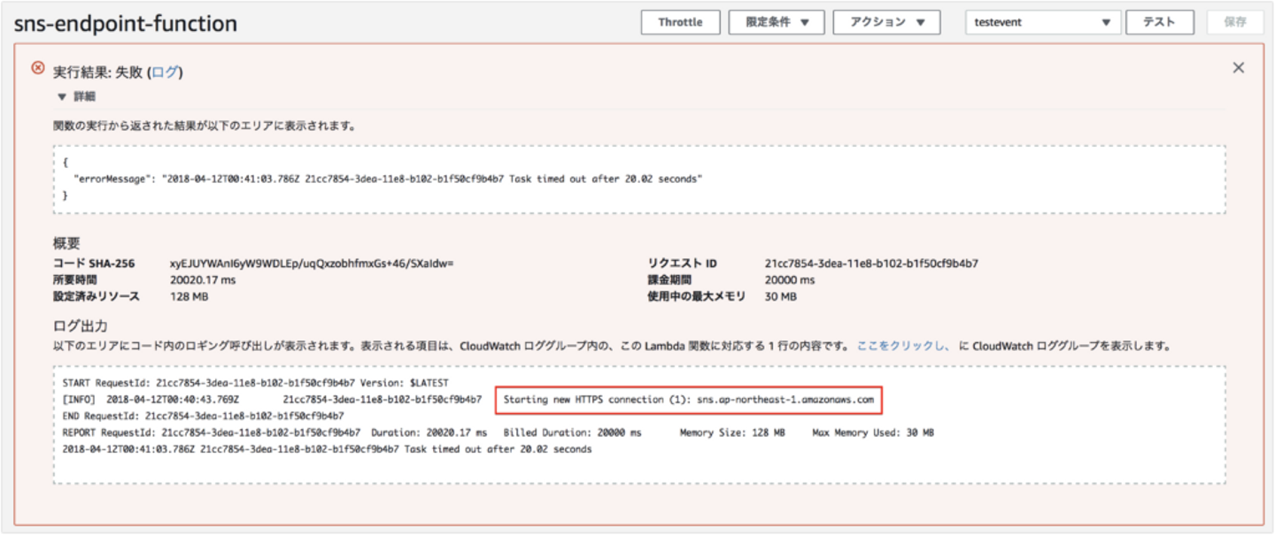 インターネットにつながっていないため sns.ap-northeast-1.amazonaws.com へ接続できずに処理がタイムアウトとなってしまいます。