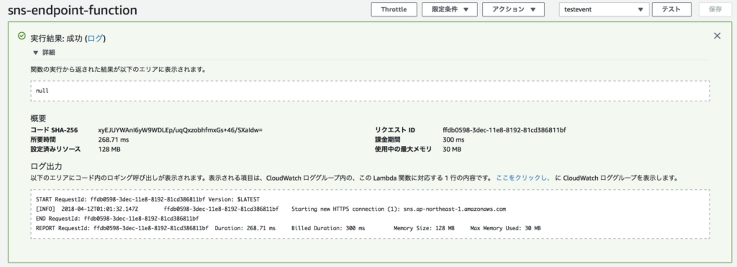 作成した Lambda ファンクションをエンドポイント作成時に選択したサブネットにデプロイし、実行した結果が以下です。