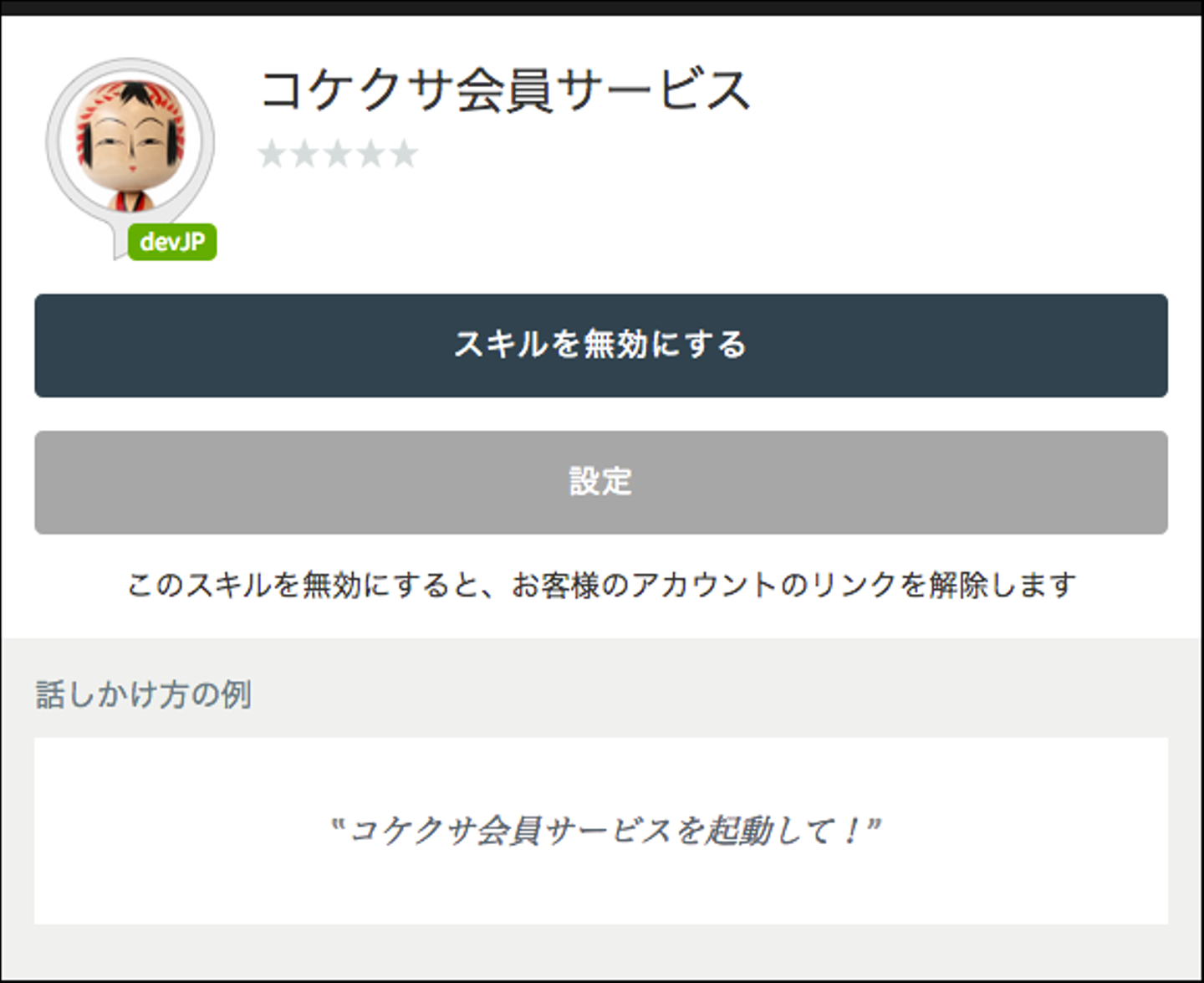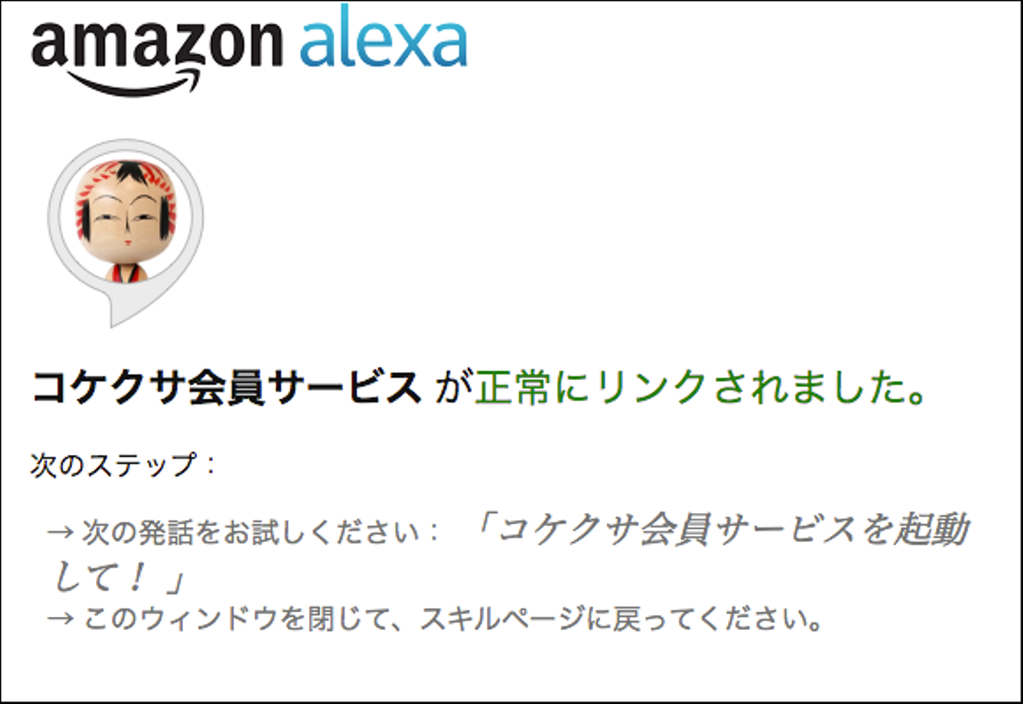 「コケクサ会員サービス」スキルは「kokexa Go」の会員さんが「いままで買ったこけしの購入履歴を確認」できるスキルです。他、このスキルでは「こけしの入荷状況やお休みの日など、お店からのお知らせも確認」 できます。