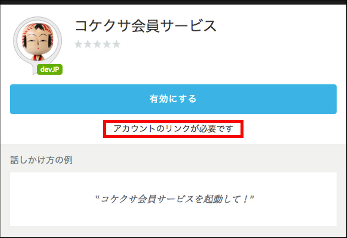 既にAlexaをお使いの方は、このように「アカウントのリンクが必要です。」と書かれたスキルを目にしたことがあるかと思います。このような状態のスキルが「ログインした人だけが使えるスキル」です。