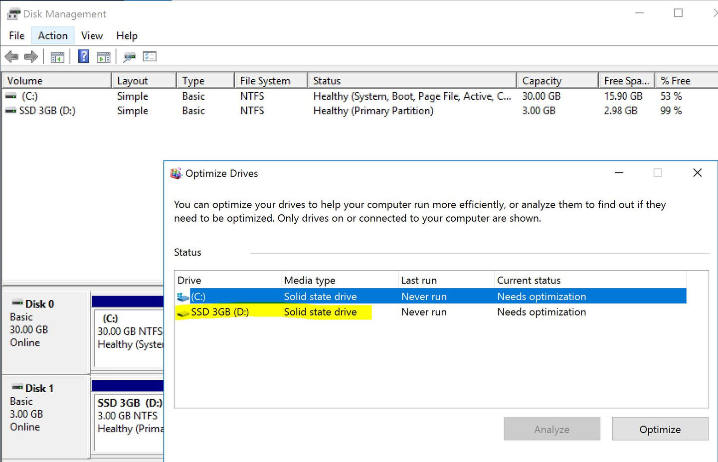 ちなみに変更後も、Optimize Drivesの画面では、Media TypeはSSD認識のままとなっています。これはどうやら「Magnetic (Standard) Volume」は裏はHDDですが、OSではSSDと認識されるようです。