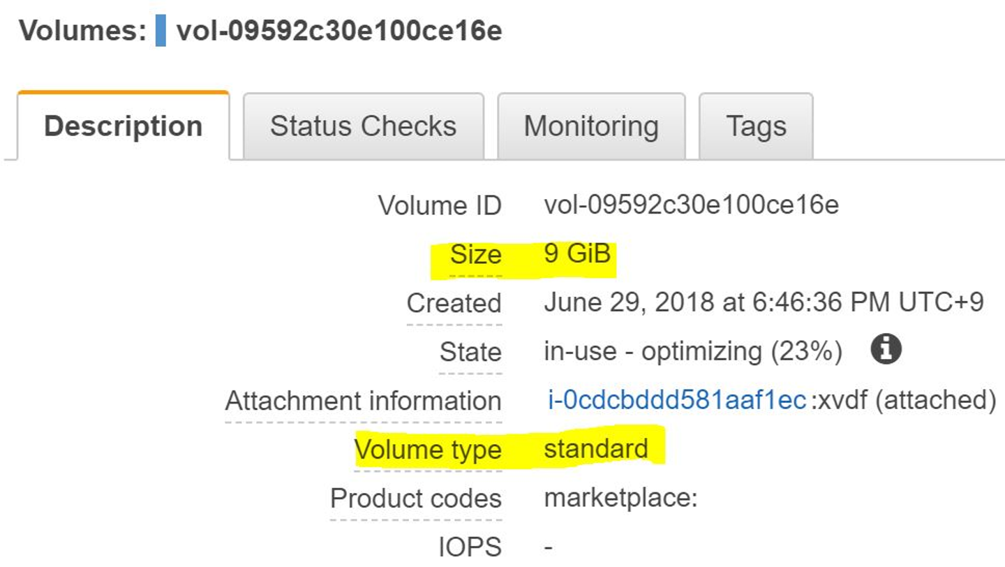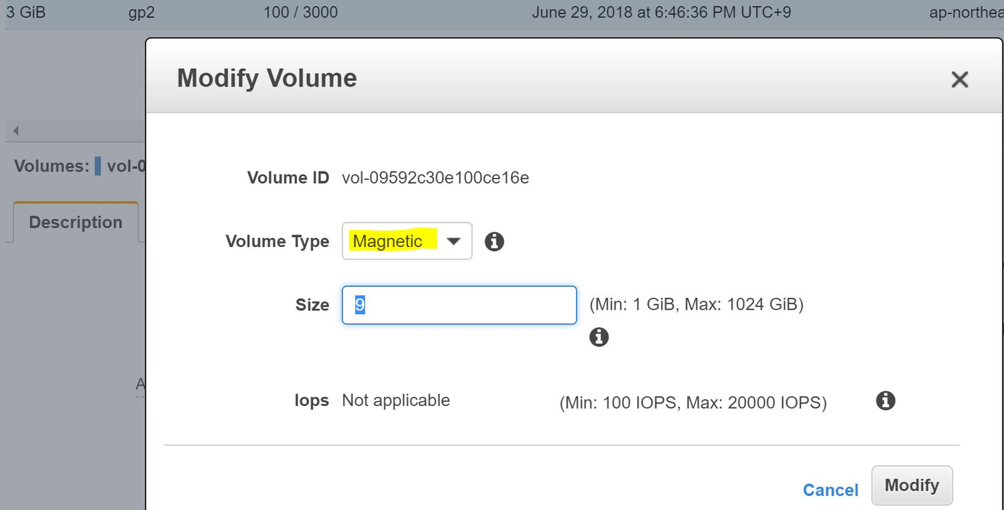 3GiBのgp2(SSD) Volumeが、9GiBのStandard(HDD) Volumeにしてみます。