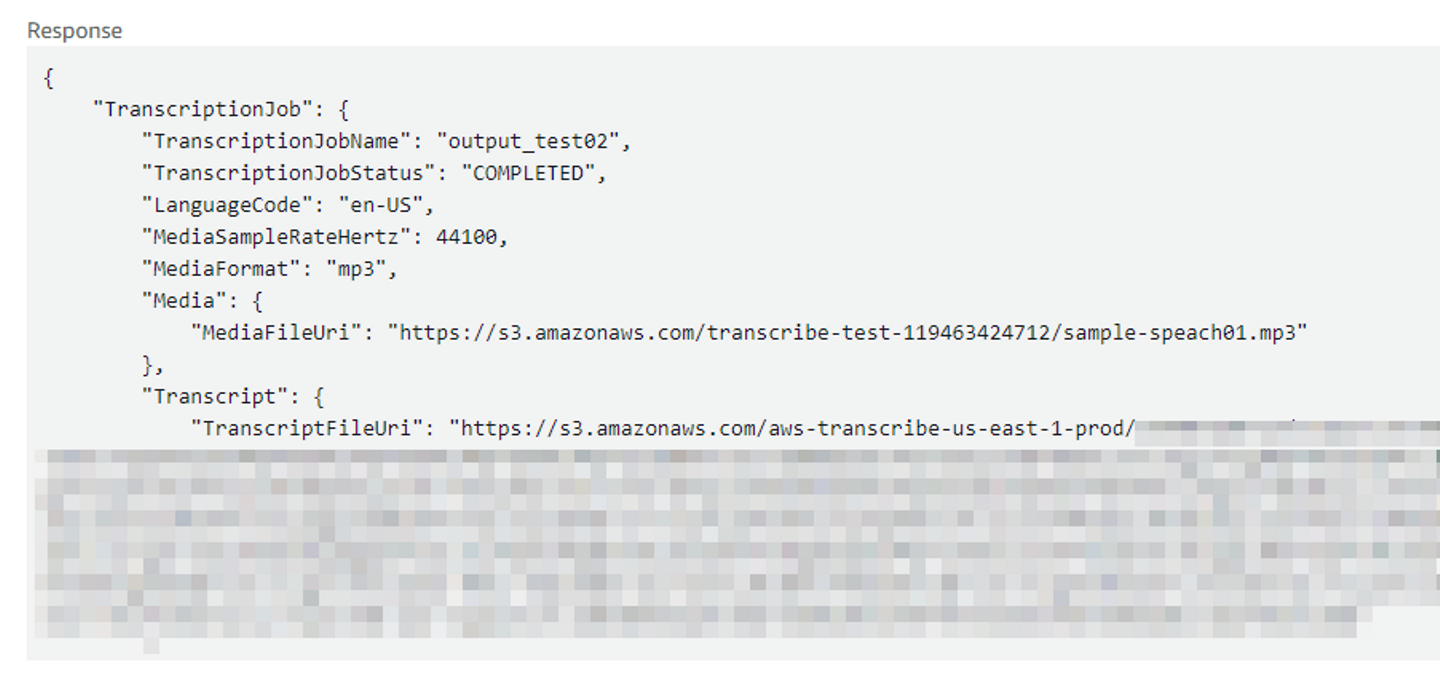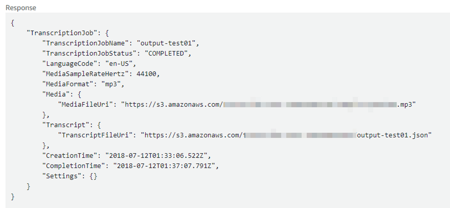 Amazon Transcribe側のS3バケットを指定した場合、GetTranscriptionJobのレスポンスのTranscriptFileUri には結果ファイルをダウンロードする署名付きURLが入ります。