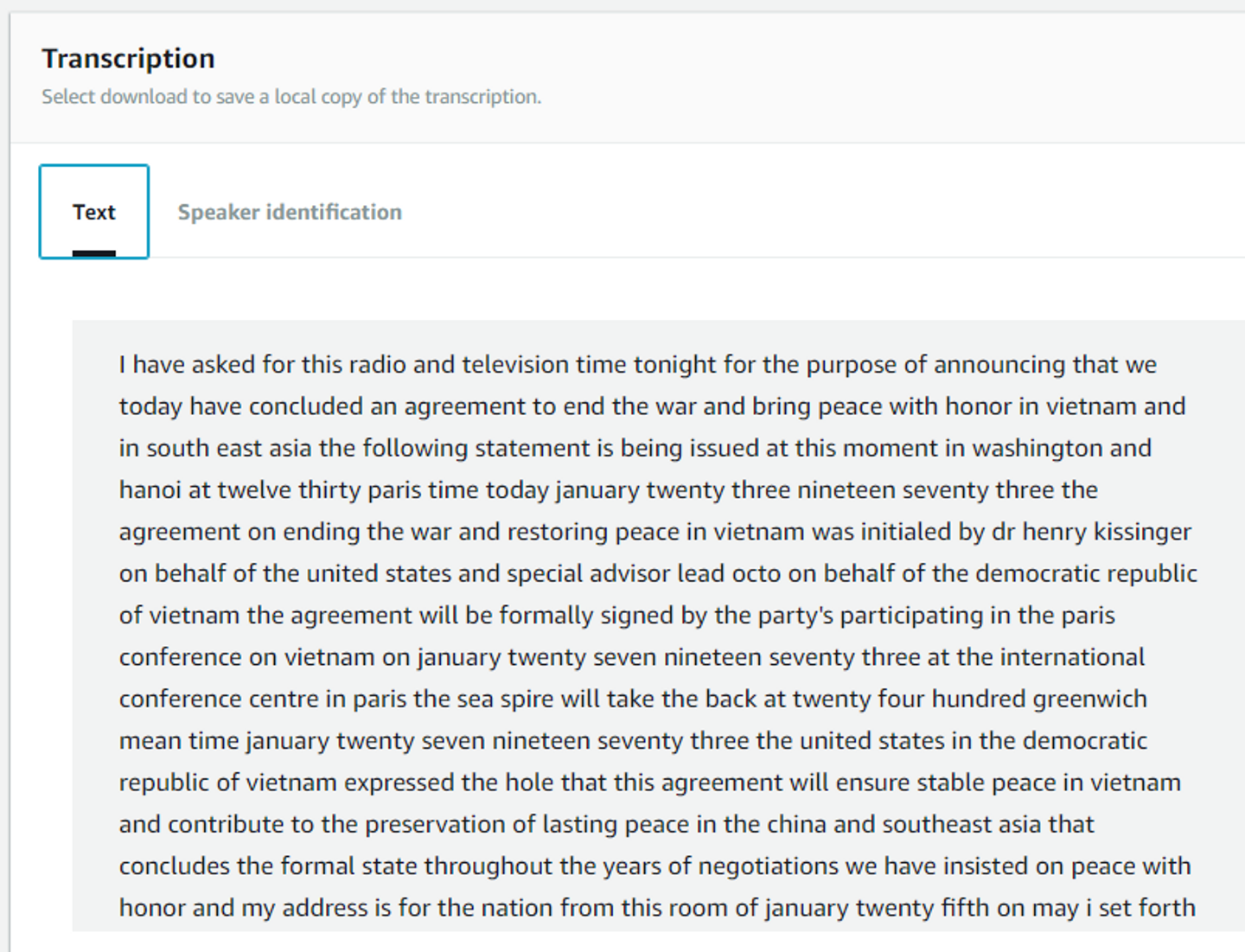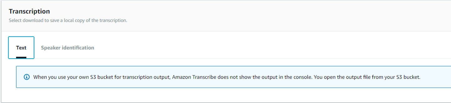 Amazon Transcribeのコンソールから直接文字お越しされてた文章と話者の識別を確認できなくなります。文字起こしされた文章の確認は、結果ファイルをS3バケットからダウンロードもしくは何らかの仕組みで可視化する必要があります。また話者の識別に関しては結果ファイルには直接書かれていない、どの単語が何秒から何秒まで話されて、どの話者が何秒から何秒まで話したかが別々で記載されているので、それらを突合する何らかの仕組みが必要になります。デフォルトのAmazon Transcribe側のS3バケットを指定すると、コンソールからはどの話者がどの単語を話したかが確認出来るので、直観的な確認が出来なくなるのはデメリットといえると思います。
