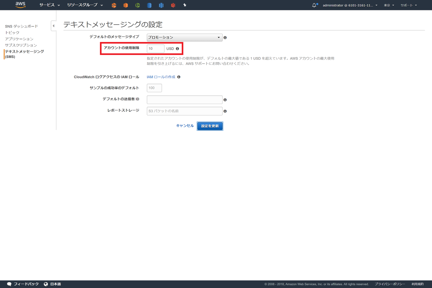 Amazon SNSのデフォルトのSMSメッセージ使用量上限は1$となっており、十数通メッセージを送ると上限に達してしまいます。