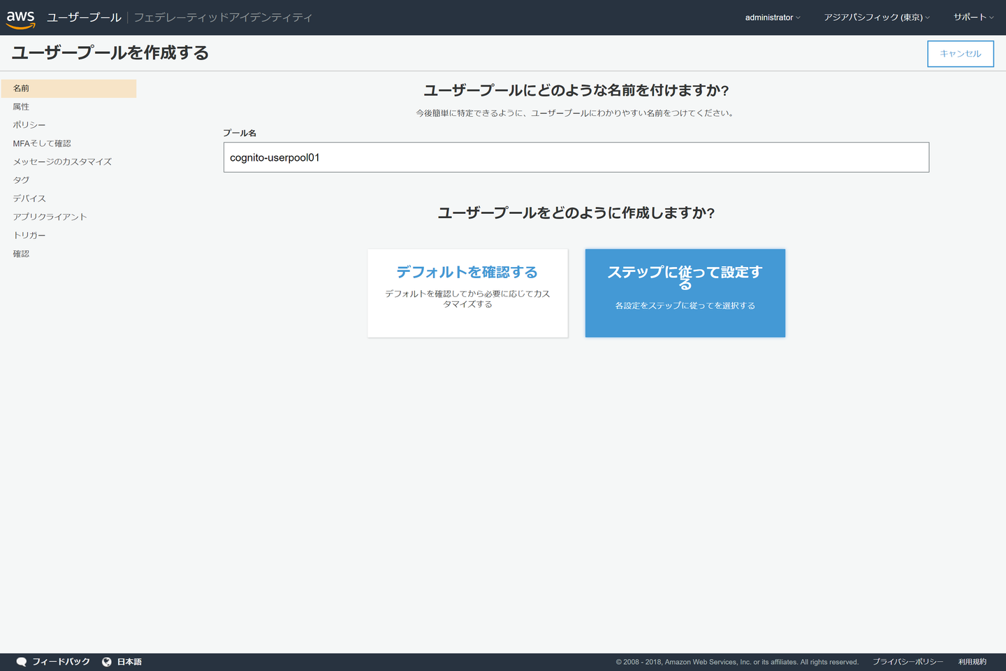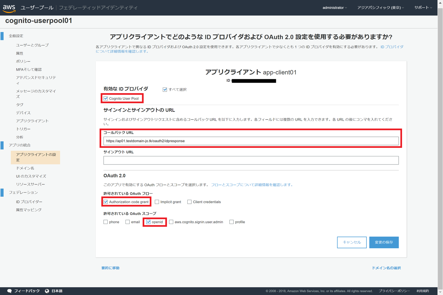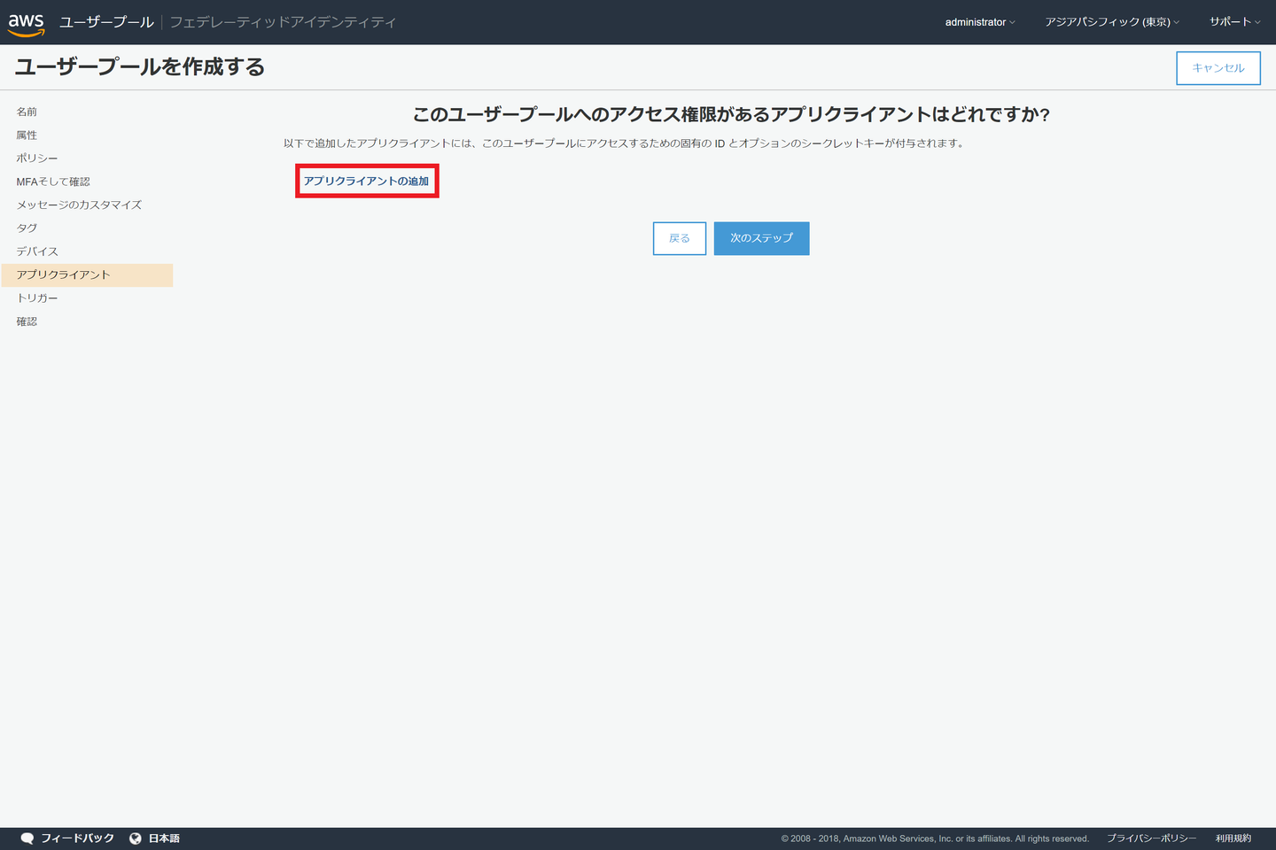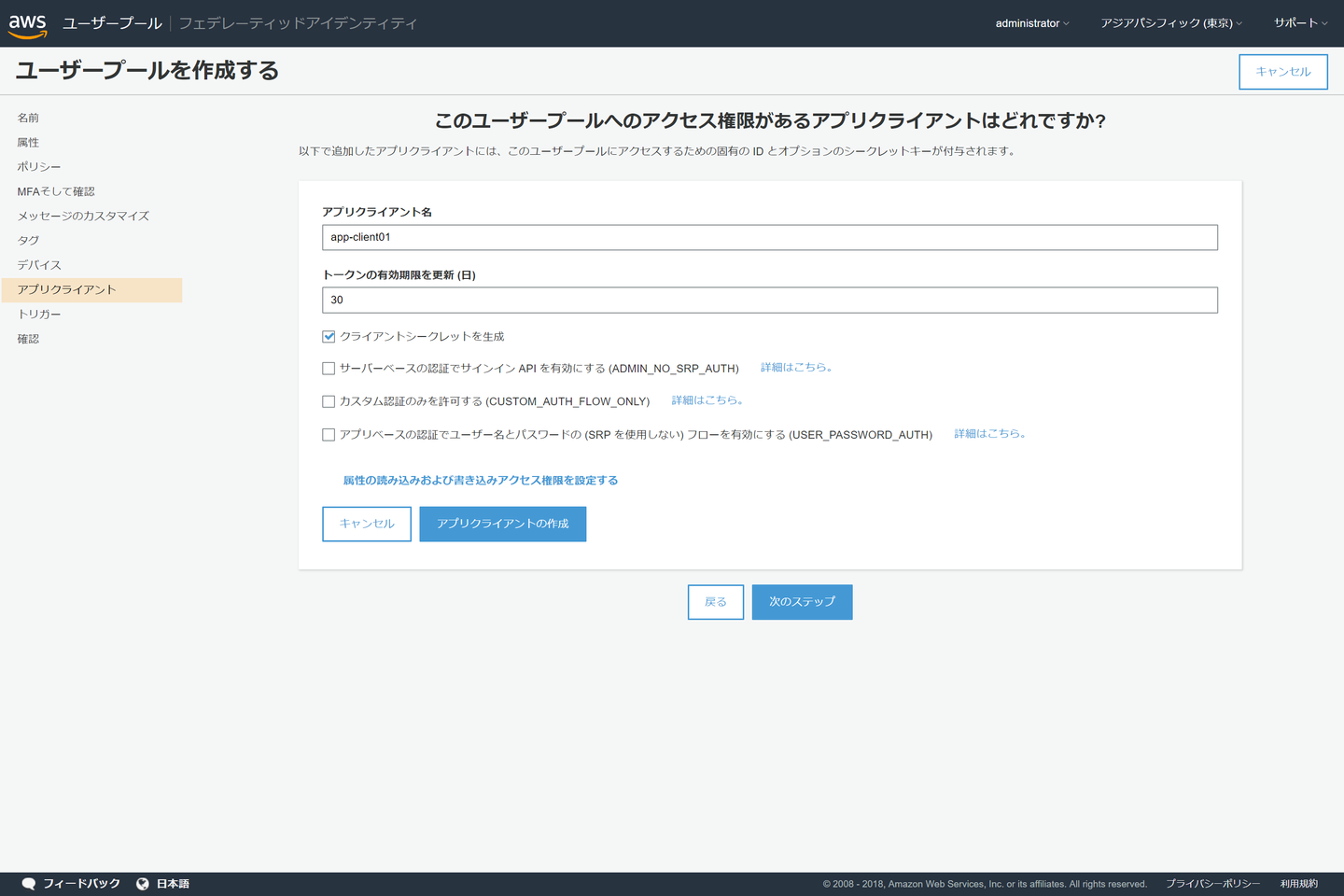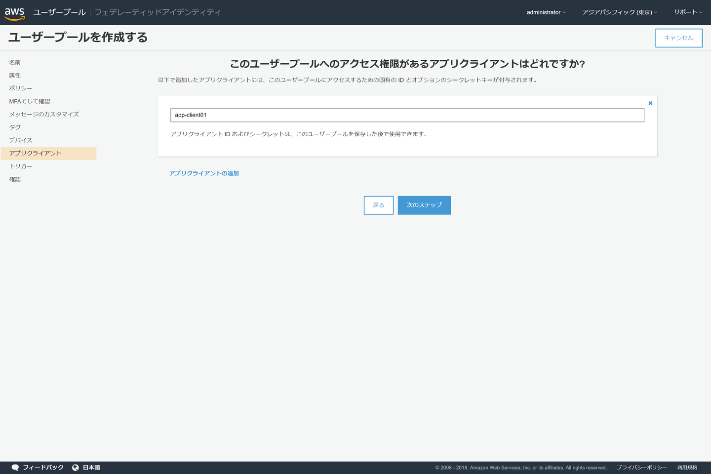 デフォルト設定のまま、アプリクライアント名を入力し、[次のステップ]をクリックします。