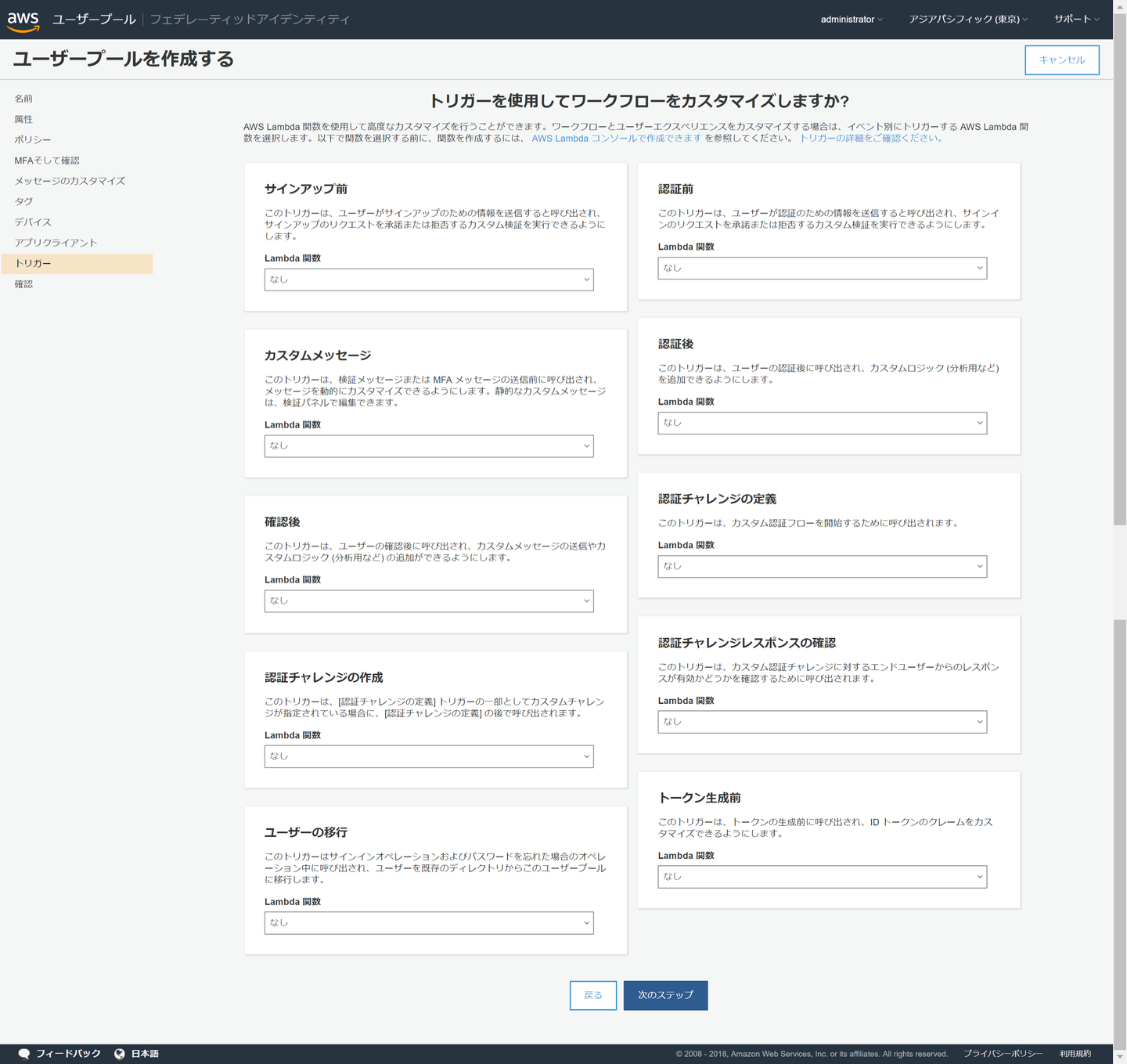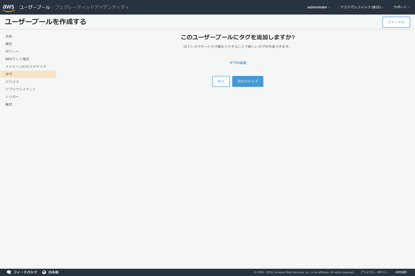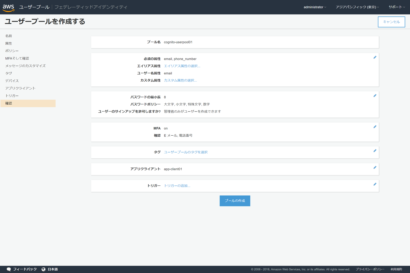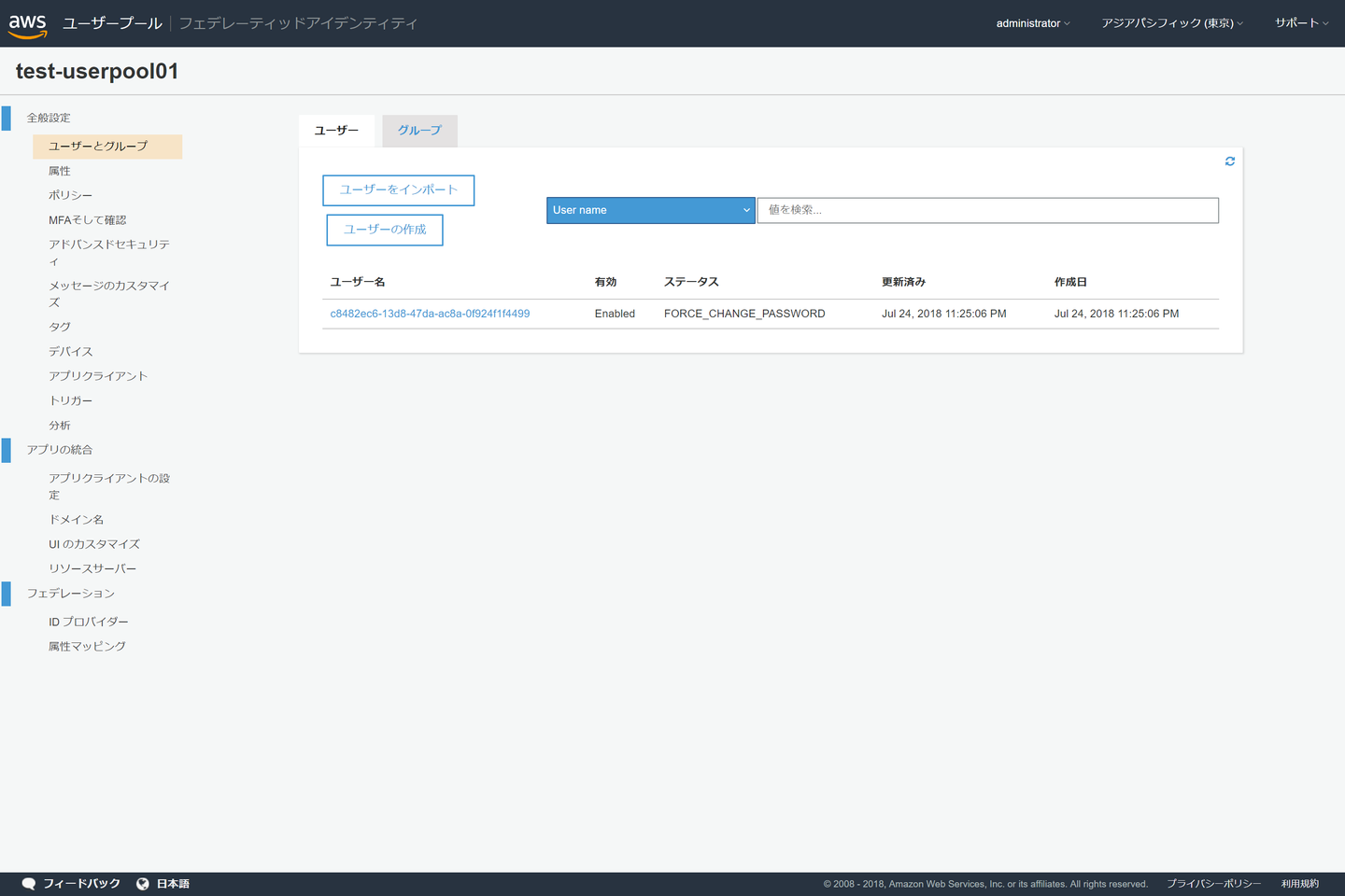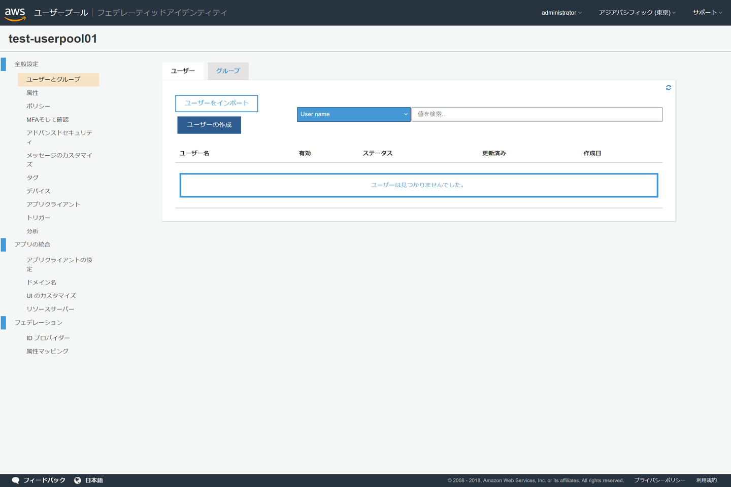 ユーザープールの管理画面の[ユーザーとグループ]にて[ユーザーの作成]をクリックします。