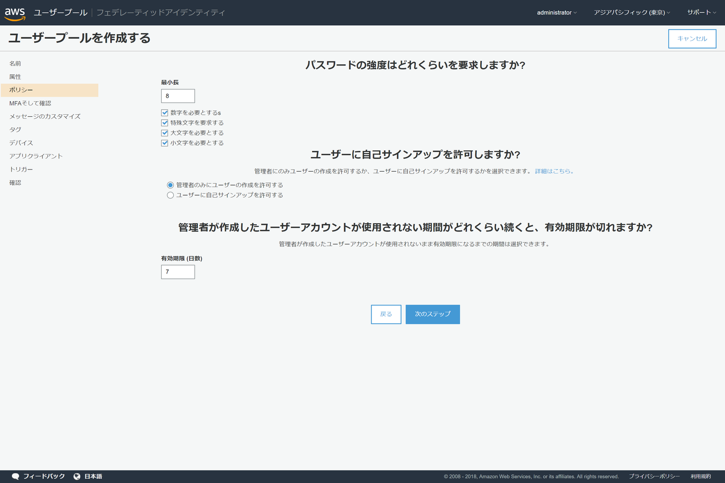 パスワード強度、有効期限はデフォルトのまま、管理者のみユーザの作成を許可としています。