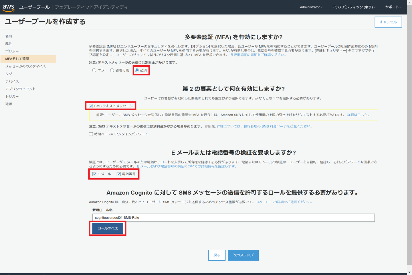 Eメール、電話番号の検証を必須とし、[ロールの作成]ボタンをクリックしてSMS送信に必要なIAMロールを作成します。