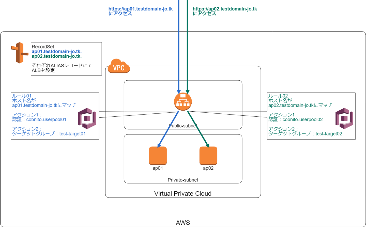 構成図にも記載のとおり、下記サブドメインのエイリアスレコードに作成したALBを登録しました。