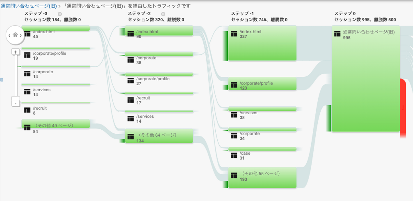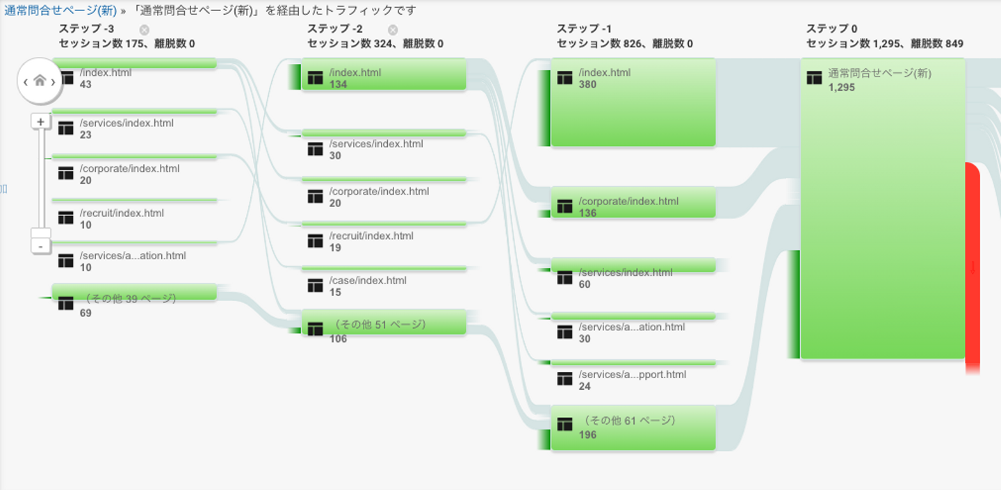 リニューアル前後でちょっとした変化はあったものの、トップページから直接お問い合わせページに進むパターンがいちばん多いということは、コーポレートサイト内のコンテンツをろくに見てもらえていないということになります。訪問者にどの情報を見てほしいのか、それを見てもらうにはどんなコンテンツを作るべきか、もう一度考え直す必要がありそうです。