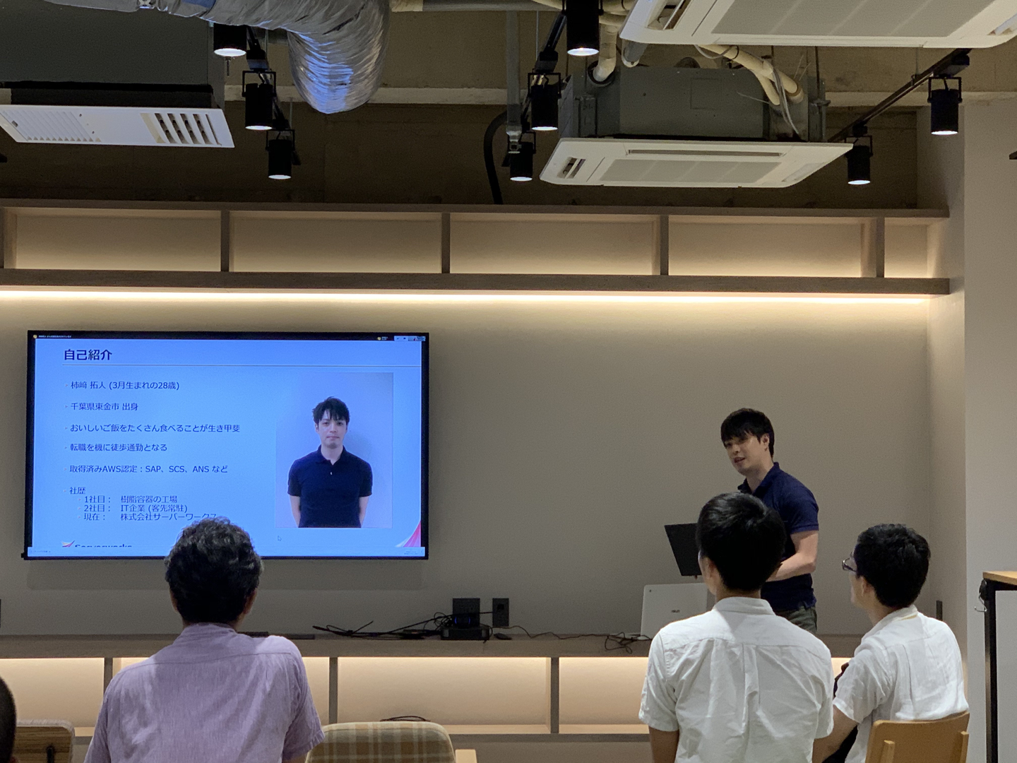 次のライトニングトークは同じくCI部技術5課の柿崎さんから。「入社2ヶ月で感じるサーバーワークスの文化」というタイトルをみて、あれ2ヶ月?そうだったけ?と思うくらいに存在感ありありです。