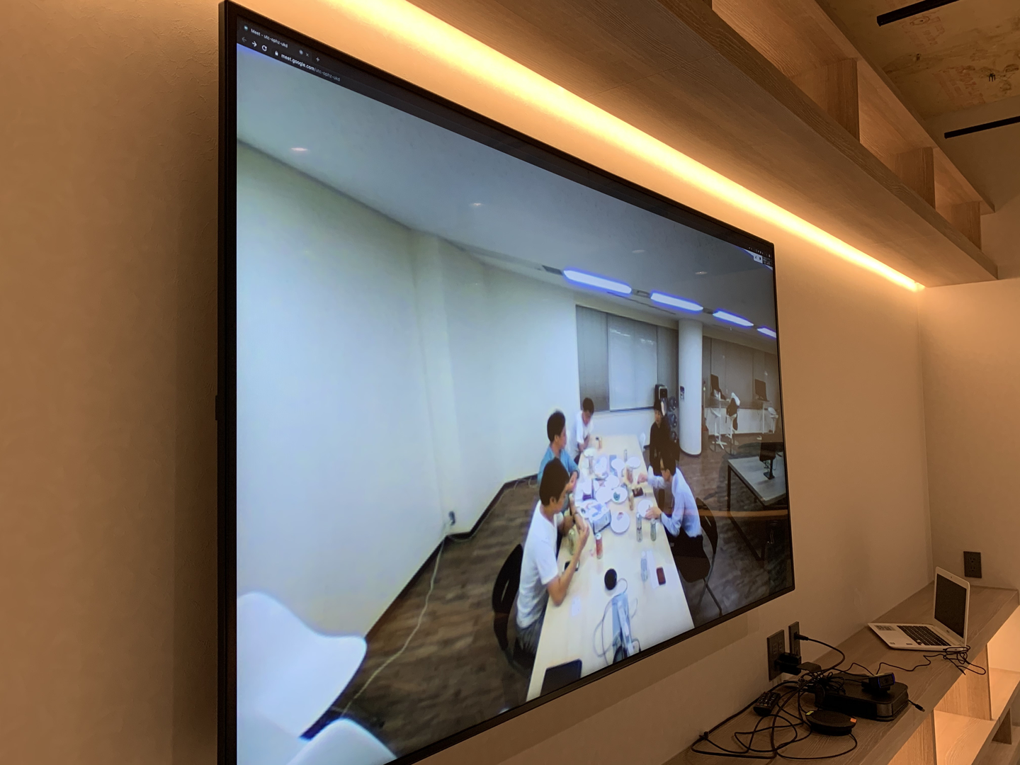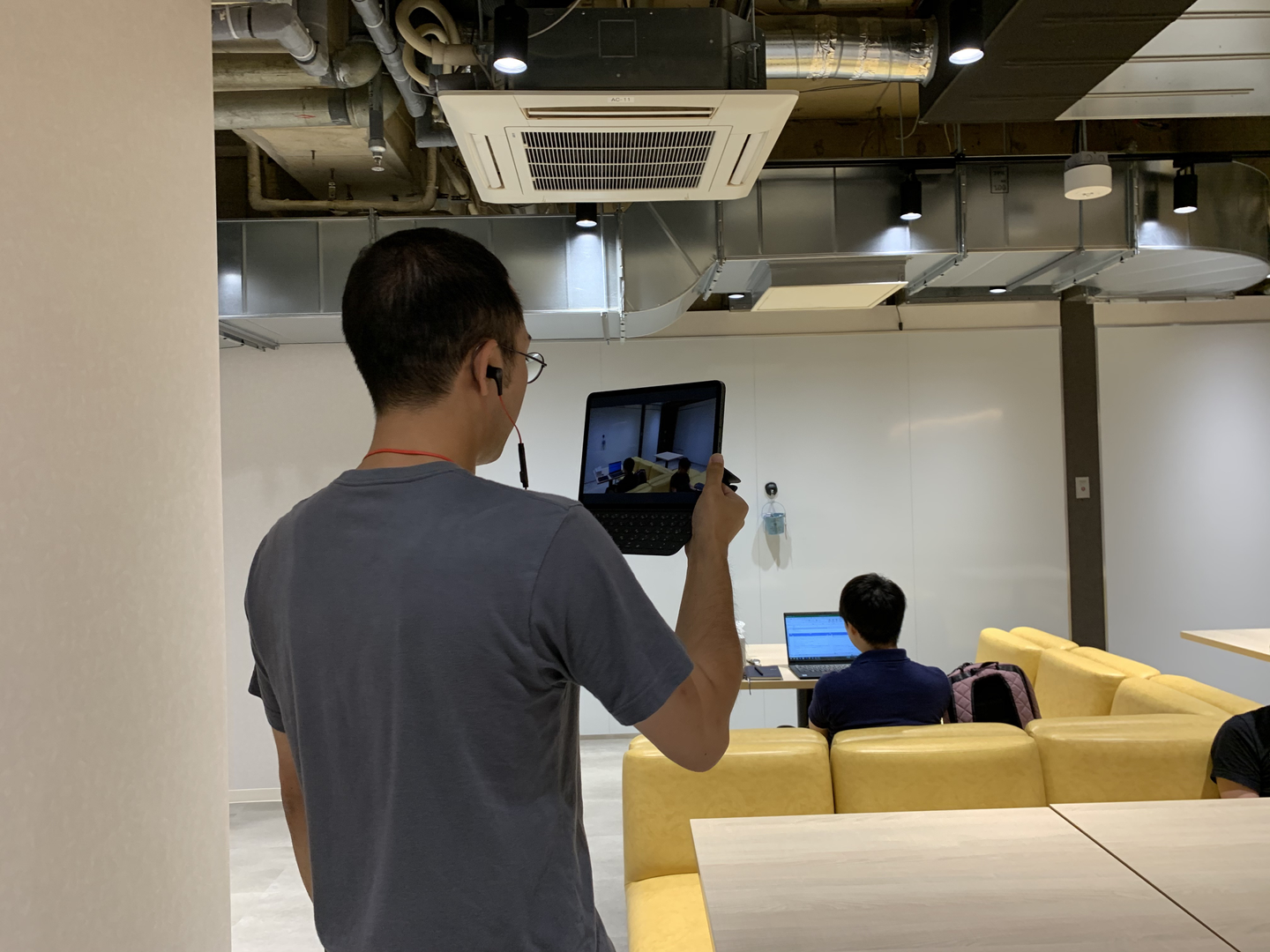 また、今回は仙台からもパブリックビューイングでご参加いただきましたので、このようにカメラで投影しながら東京オフィスのオフィスツアーをいたしました。