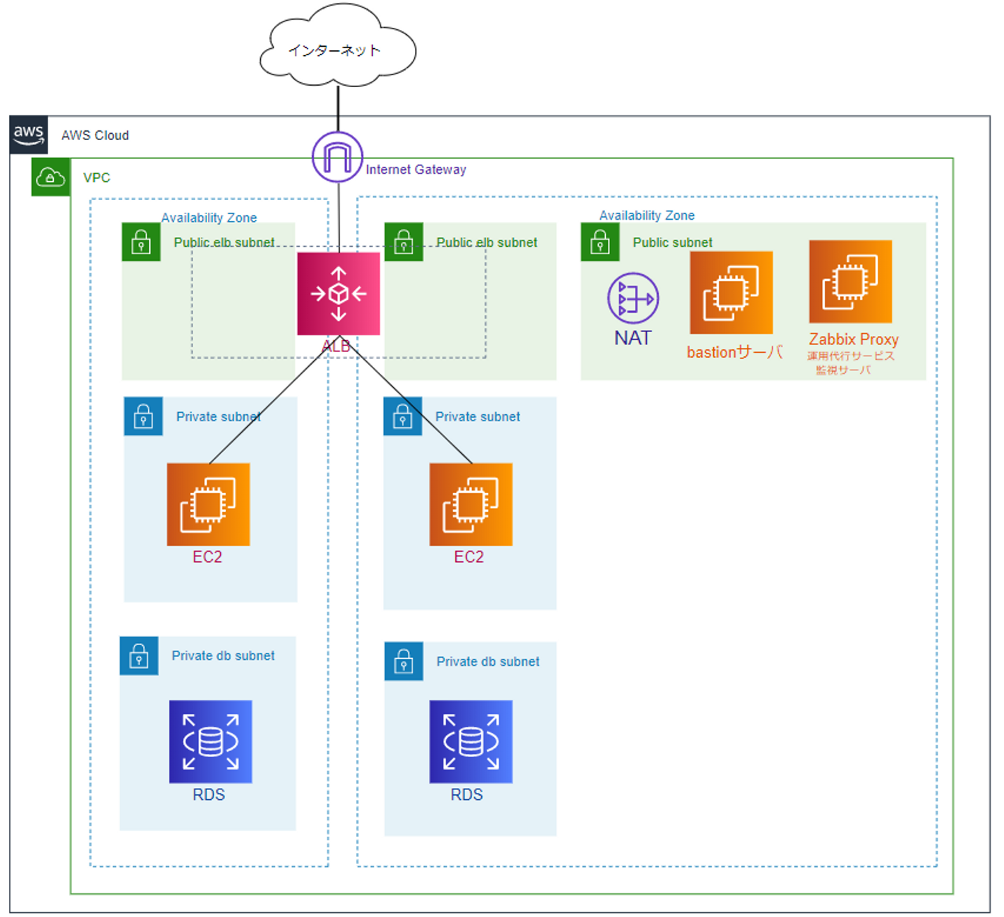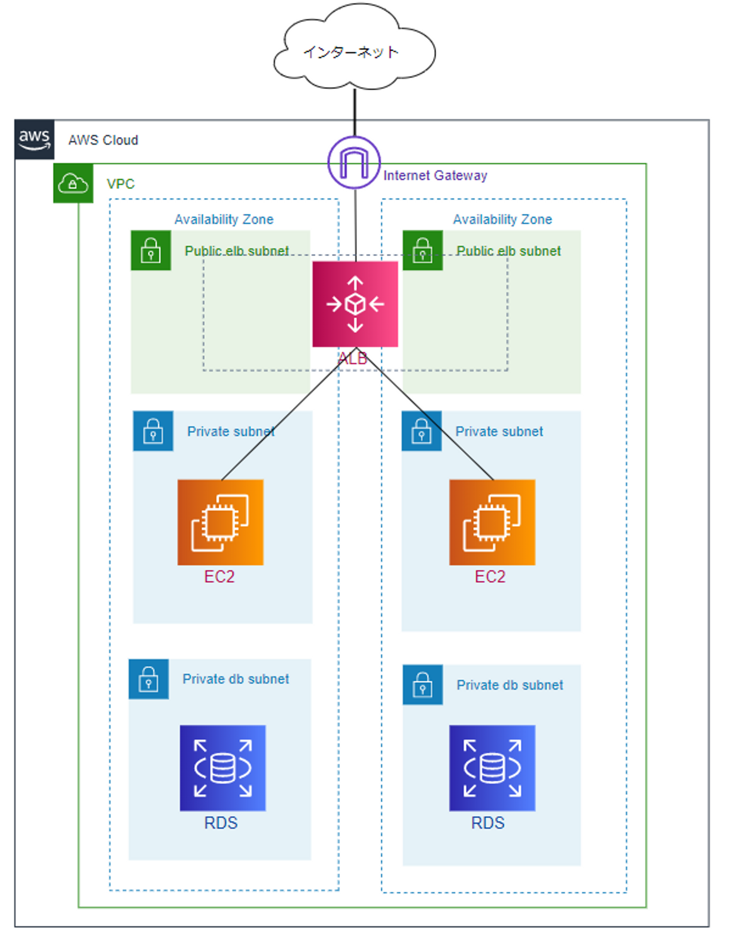 ALBを経由させて、2台のWebサーバで負荷分散します。WebサーバとDBサーバをそれぞれ複数のAvailability Zoneに配置することでサーバ冗長化となります。