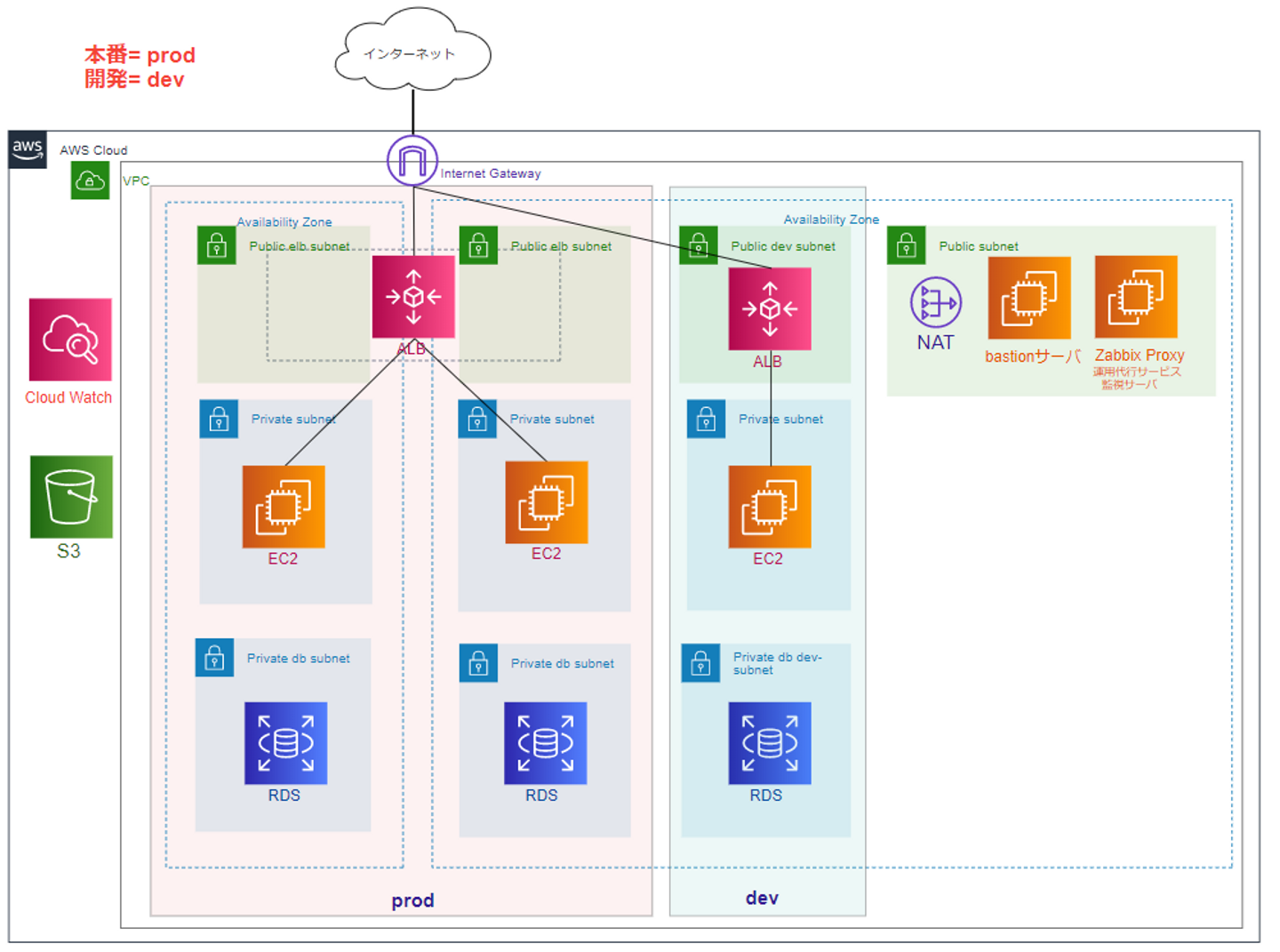 開発用のインスタンスを別のPrivate Subnetに構築し、Cloud Watchのログの保管場所としてS3を設置しました。